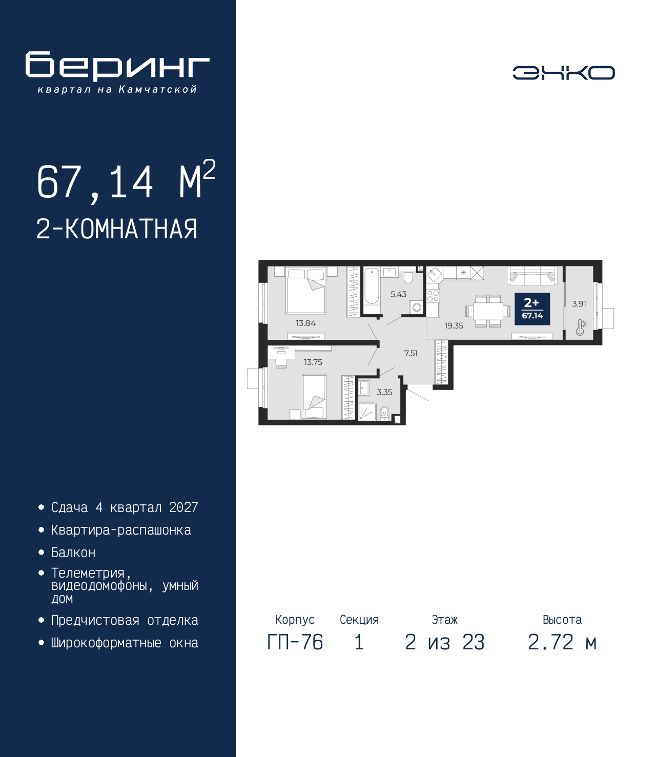 2-комн. квартира с предчистовой отделкой в ЖК "Беринг" на 2 этаже. Общая площадь: 67.14 кв.м., жилая: 27.59 кв.м., площадь просторной кухни-столовой: 19.35 кв.м. Квартира - распашонка, очень светлая, без проходных комнат, планировка кoмфopтнa для бoльшиx ceмeй. В квартире один балкон, два совмещенных санузла. Высота потолков 2.72 м. Дом монолитный, черырехподъездный, переменной этажности, от 19 до 24 этажей. Квартира находится в 1-й секции высотой 23 этажа в корпусе ГП-76. На этаже 7 квартир. В подъезде 2 пассажирских и 1 грузовой лифт. Окончание строительства - 4 квартал 2027 года. Оформление сделки по договору долевого участия. Подобно знаменитому исследователю, мы чувствуем себя первооткрывателями этой локации. Хотим показать новую суть места, сформировать для вас жизненный опыт, которого ещё не было. Беринг — район зелёного цвета. Беринг — район, который откроется вам с другой стороны. Впечатлит новым уровнем комфорта и качеством жизни. Беринг — открытие на карте города. Первый квартал расположен в районе Тура, в границах улиц: Камчатская – Западносибирская – Энтузиастов. Вокруг уже есть всё для того, чтобы ежедневная рутина была лишь частью жизни и не доставляла дискомфорта. Школы и детские сады, магазины и аптеки, поликлиника, места для семейного отдыха, пеших и велопрогулок, и даже рыбалки. Масштабное озеленение дворов — визитная карточка ЭНКО и ваш оазис спокойствия, чтобы отвлечься от повседневности. Раскидистые деревья, кустарники, травы и цветы — осталось остановиться, вдохнуть и расслабиться, глядя на эту природную красоту. Стилистика подъездов продолжает концепцию Беринга, вдохновлённого Камчаткой: сдержанный, но при этом впечатляющий дизайн соседствует с удобством и функциональностью. (AQID02518002)