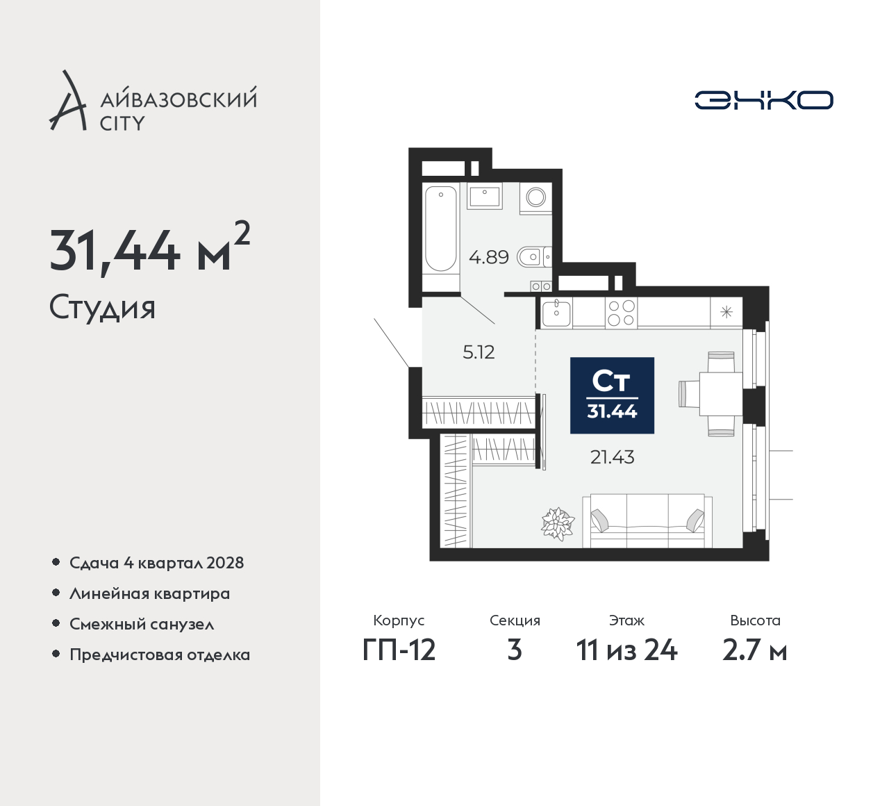 1-комн. квартира-студия от застройщика с предчистовой отделкой в ЖК "Айвазовский City" на 11 этаже. Общая площадь: 31.44 кв.м., площадь гостиной 21.43 кв.м., из которых 5 кв.м. выделено под кухонную зону. Все окна выходят на одну сторону. В квартире один совмещенный санузел. Высота потолков 2.7 м. Дом монолитный, многоподъездный, высотой 24 этажа. Квартира находится в 3-й секции в корпусе ГП-12. На этаже 6 квартир. В подъезде 1 пассажирский и 1 грузовой лифт. Окончание строительства - 4 квартал 2028 года. Оформление сделки по договору долевого участия. Новый жилой район располагается в живописном месте на берегу Туры в центральной части города. Принципиально новое пространство для жизни в центре современного города для тех, чьи мечты сбываются, кто нацелен на постоянный рост, перемены к лучшему для себя и своих близких. Каждая деталь Айвазовский City вдохновляет и заряжает на новые свершения: авторская архитектура, сбалансированная продуманная инфраструктура, дизайнерские дворы со спортивными и детскими площадками, парковые зоны с фонтанами, водный канал, украшающий центральный прогулочный маршрут района и многое другое. В 2019 года проект стал лауреатом престижной премии Urban Awards 2019 в номинации «Лучший строящийся региональный жилой комплекс бизнес-класса». Главная особенность Айвазовский City - соседство разных архитектурных школ в рамках одного дома. Изысканная классика, выразительная эклектика и оригинальный модерн - жить в одном из таких домов настоящий повод для гордости. Айвазовский City это идеальное сочетание комфорта, технологий и развитой инфраструктуры. Вход в подъезд возможен с улицы и со двора. Отправляясь на работу или за покупками, жители могут выйти с внешней стороны дома, а для прогулки с ребенком – со стороны двора. Экологически чистые материалы и энергосберегающие технологии, качественное освещение общественных зон, видеонаблюдение по всей территории жилого района (в том числе в подъездах, лифтах и в подземном паркинге), закрытые дворы с доступом только для жителей Айвазовский City. Часть домов в Айвазовский City будут оснащены подземным паркингом. Востребованный в нашем климатическом поясе формат хранения автомобилей защитит собственность владельца в любое время года. Аккредитация в банках: ОАО «Альфа-Банк», ПАО Банк «ВТБ», ПАО «Газпромбанк», «Сбербанк России», ПАО «Промсвязьбанк» и других. (AQID02525513)