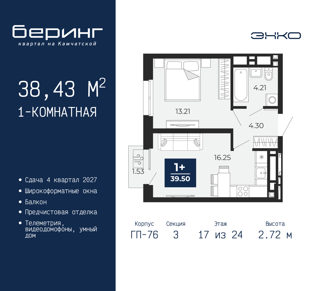 Просторная 1-комн. квартира с предчистовой отделкой в ЖК "Беринг" на 17 этаже. Общая площадь: 38.43 кв.м., жилая: 13.21 кв.м., площадь просторной кухни-столовой: 16.25 кв.м. Все окна выходят на одну сторону. В квартире один балкон, один совмещенный санузел. Высота потолков 2.72 м. Дом монолитный, черырехподъездный, переменной этажности, от 19 до 24 этажей. Квартира находится в 3-й секции высотой 24 этажа в корпусе ГП-76. На этаже 6 квартир. В подъезде 1 пассажирский и 1 грузовой лифт. Окончание строительства - 4 квартал 2027 года. Оформление сделки по договору долевого участия. Подобно знаменитому исследователю, мы чувствуем себя первооткрывателями этой локации. Хотим показать новую суть места, сформировать для вас жизненный опыт, которого ещё не было. Беринг — район зелёного цвета. Беринг — район, который откроется вам с другой стороны. Впечатлит новым уровнем комфорта и качеством жизни. Беринг — открытие на карте города. Первый квартал расположен в районе Тура, в границах улиц: Камчатская – Западносибирская – Энтузиастов. Вокруг уже есть всё для того, чтобы ежедневная рутина была лишь частью жизни и не доставляла дискомфорта. Школы и детские сады, магазины и аптеки, поликлиника, места для семейного отдыха, пеших и велопрогулок, и даже рыбалки. Масштабное озеленение дворов — визитная карточка ЭНКО и ваш оазис спокойствия, чтобы отвлечься от повседневности. Раскидистые деревья, кустарники, травы и цветы — осталось остановиться, вдохнуть и расслабиться, глядя на эту природную красоту. Стилистика подъездов продолжает концепцию Беринга, вдохновлённого Камчаткой: сдержанный, но при этом впечатляющий дизайн соседствует с удобством и функциональностью. (AQID02529230)