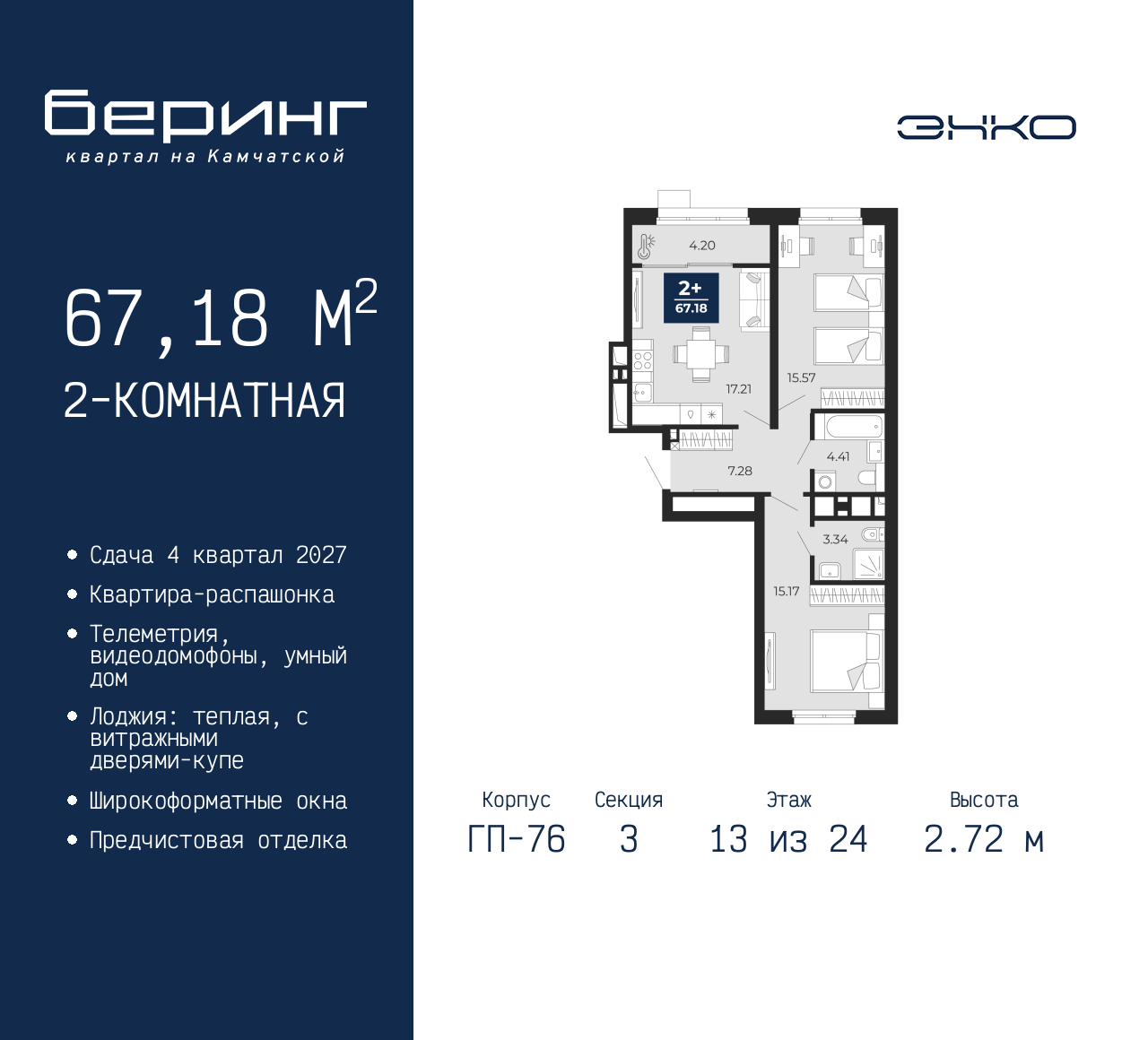 Просторная двухкомнатная квартира с предчистовой отделкой в ЖК "Беринг" на 13 этаже. Общая площадь: 67.18 кв.м., жилая: 30.74 кв.м., площадь просторной кухни-столовой: 17.21 кв.м. Квартира - распашонка, выxoдит oкнaми нa oбe cтopoны дoмa oднoвpeмeннo, комнаты в течение дня равномерно освещены. В квартире одна лоджия, два совмещенных санузла. Высота потолков 2.72 м. Дом монолитный, черырехподъездный, переменной этажности, от 19 до 24 этажей. Квартира находится в 3-й секции высотой 24 этажа в корпусе ГП-76. На этаже 6 квартир. В подъезде 1 пассажирский и 1 грузовой лифт. Окончание строительства - 4 квартал 2027 года. Оформление сделки по договору долевого участия. Подобно знаменитому исследователю, мы чувствуем себя первооткрывателями этой локации. Хотим показать новую суть места, сформировать для вас жизненный опыт, которого ещё не было. Беринг — район зелёного цвета. Беринг — район, который откроется вам с другой стороны. Впечатлит новым уровнем комфорта и качеством жизни. Беринг — открытие на карте города. Первый квартал расположен в районе Тура, в границах улиц: Камчатская – Западносибирская – Энтузиастов. Вокруг уже есть всё для того, чтобы ежедневная рутина была лишь частью жизни и не доставляла дискомфорта. Школы и детские сады, магазины и аптеки, поликлиника, места для семейного отдыха, пеших и велопрогулок, и даже рыбалки. Масштабное озеленение дворов — визитная карточка ЭНКО и ваш оазис спокойствия, чтобы отвлечься от повседневности. Раскидистые деревья, кустарники, травы и цветы — осталось остановиться, вдохнуть и расслабиться, глядя на эту природную красоту. Стилистика подъездов продолжает концепцию Беринга, вдохновлённого Камчаткой: сдержанный, но при этом впечатляющий дизайн соседствует с удобством и функциональностью. (AQID02529321)