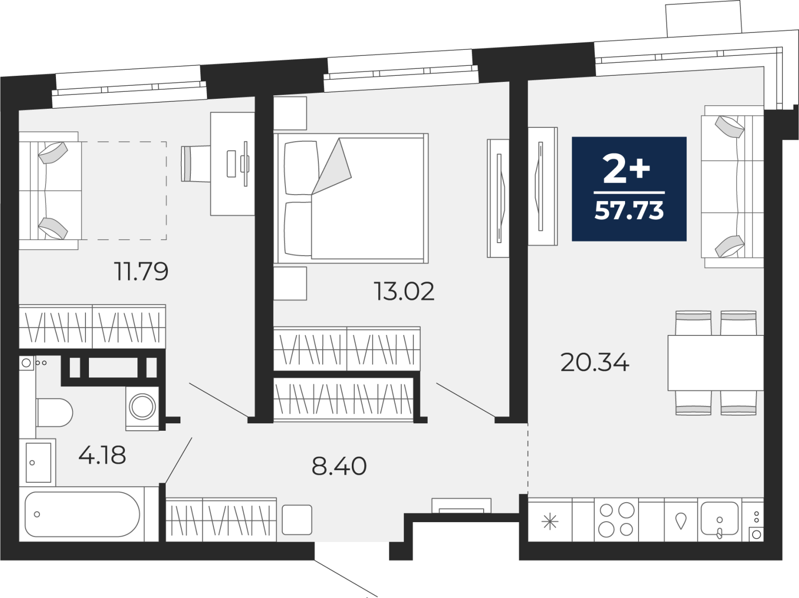 - Общая площадь 57.73 м²