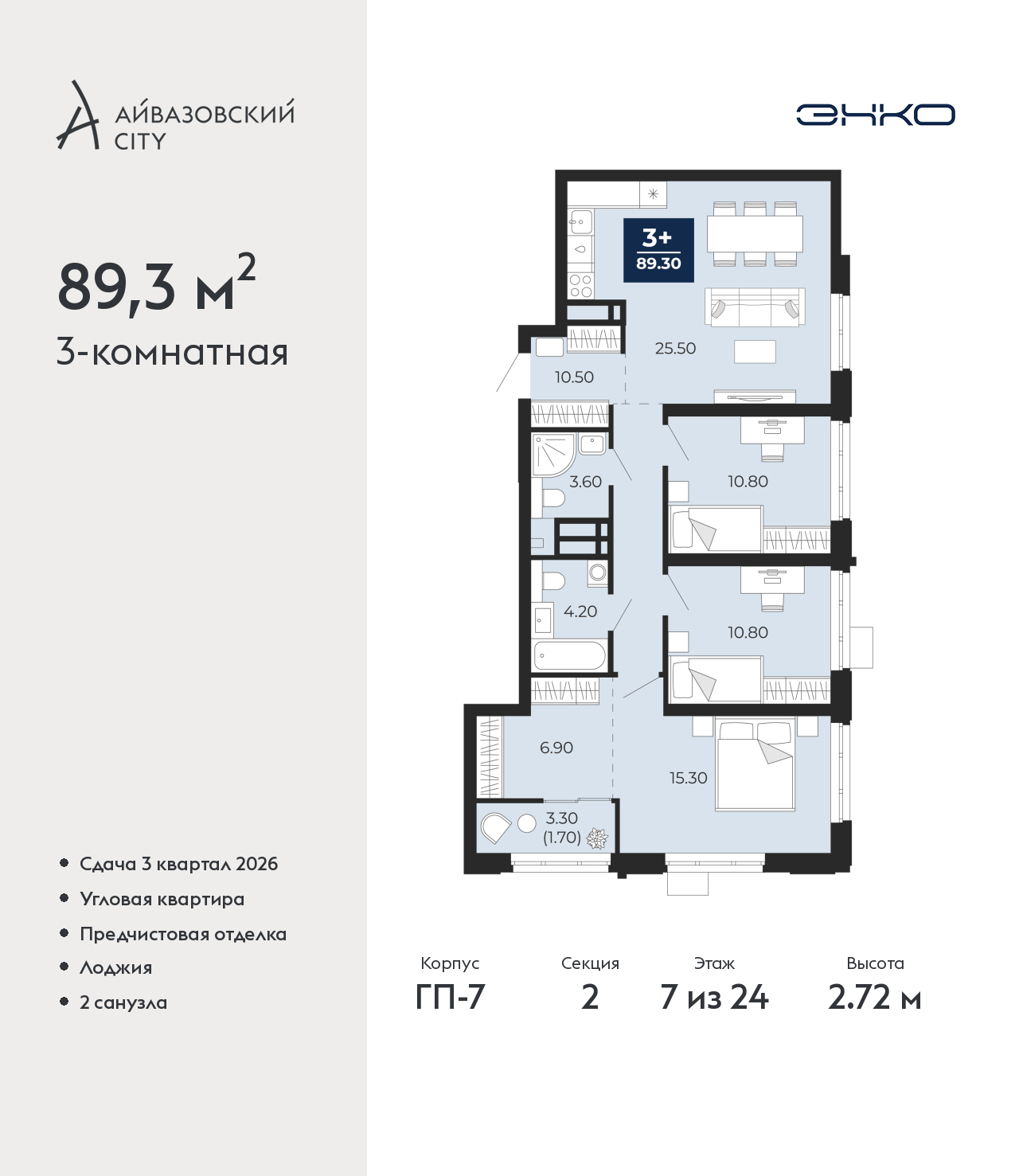 Продается 3-комн. квартира с предчистовой отделкой в ЖК "Айвазовский City" на 7 этаже. Общая площадь: 89.3 кв.м., жилая: 36.9 кв.м., площадь просторной кухни-столовой: 25.5 кв.м. Угловая квартира, идеально подойдет любителям тишины и панорамных видов. В квартире одна лоджия, два совмещенных санузла. Высота потолков 2.72 м. Дом монолитный, многоподъездный, переменной этажности, от 9 до 24 этажей. Квартира находится во 2-й секции высотой 24 этажа в корпусе ГП-7. На этаже 7 квартир. В подъезде 1 пассажирский и 2 грузовых лифта. Окончание строительства - 3 квартал 2026 года. Оформление сделки по договору долевого участия. Новый жилой район располагается в живописном месте на берегу Туры в центральной части города. Принципиально новое пространство для жизни в центре современного города для тех, чьи мечты сбываются, кто нацелен на постоянный рост, перемены к лучшему для себя и своих близких. Каждая деталь Айвазовский City вдохновляет и заряжает на новые свершения: авторская архитектура, сбалансированная продуманная инфраструктура, дизайнерские дворы со спортивными и детскими площадками, парковые зоны с фонтанами, водный канал, украшающий центральный прогулочный маршрут района и многое другое. В 2019 года проект стал лауреатом престижной премии Urban Awards 2019 в номинации «Лучший строящийся региональный жилой комплекс бизнес-класса». Главная особенность Айвазовский City - соседство разных архитектурных школ в рамках одного дома. Изысканная классика, выразительная эклектика и оригинальный модерн - жить в одном из таких домов настоящий повод для гордости. Айвазовский City это идеальное сочетание комфорта, технологий и развитой инфраструктуры. Вход в подъезд возможен с улицы и со двора. Отправляясь на работу или за покупками, жители могут выйти с внешней стороны дома, а для прогулки с ребенком – со стороны двора. Экологически чистые материалы и энергосберегающие технологии, качественное освещение общественных зон, видеонаблюдение по всей территории жилого района (в том числе в подъездах, лифтах и в подземном паркинге), закрытые дворы с доступом только для жителей Айвазовский City. Часть домов в Айвазовский City будут оснащены подземным паркингом. Востребованный в нашем климатическом поясе формат хранения автомобилей защитит собственность владельца в любое время года. Аккредитация в банках: «Сбербанк России», ПАО Банк «ВТБ», ПАО «Газпромбанк», ОАО «Альфа-Банк», ПАО АКБ «Абсолют Банк» и других. (AQID02487910)