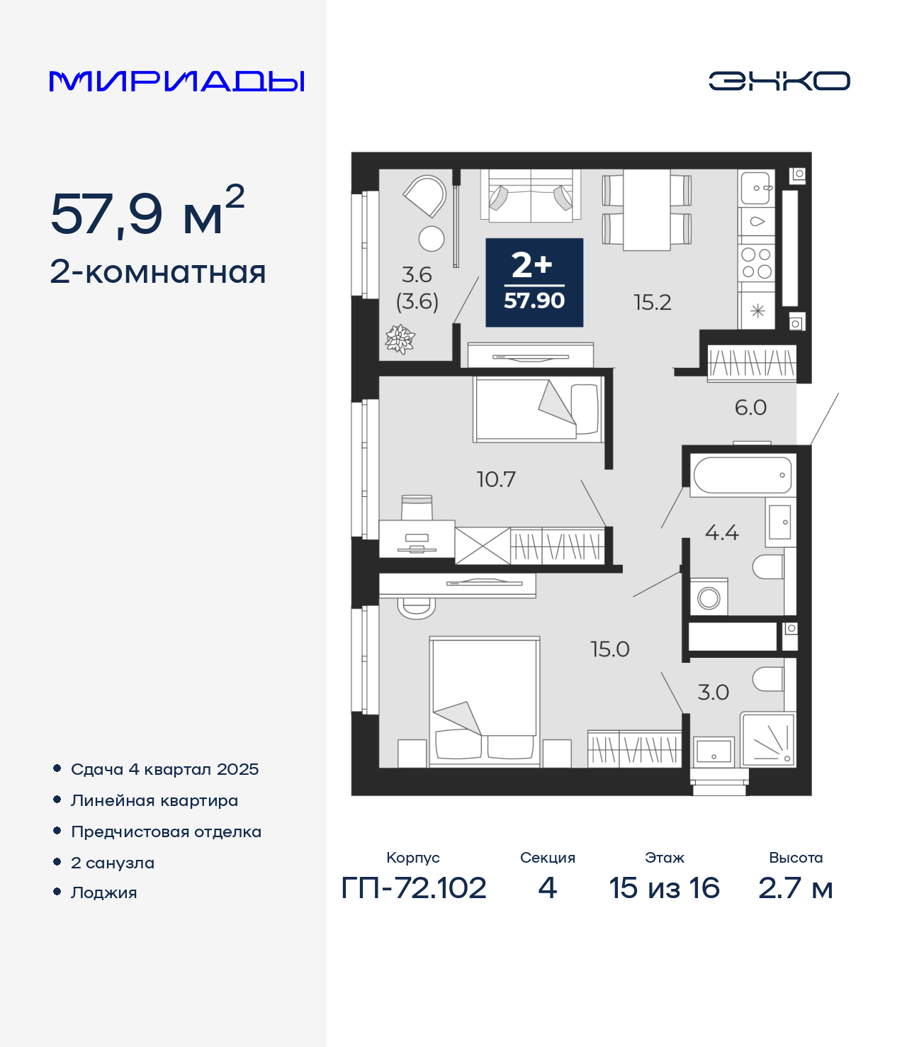 - Общая площадь 57.9 м²