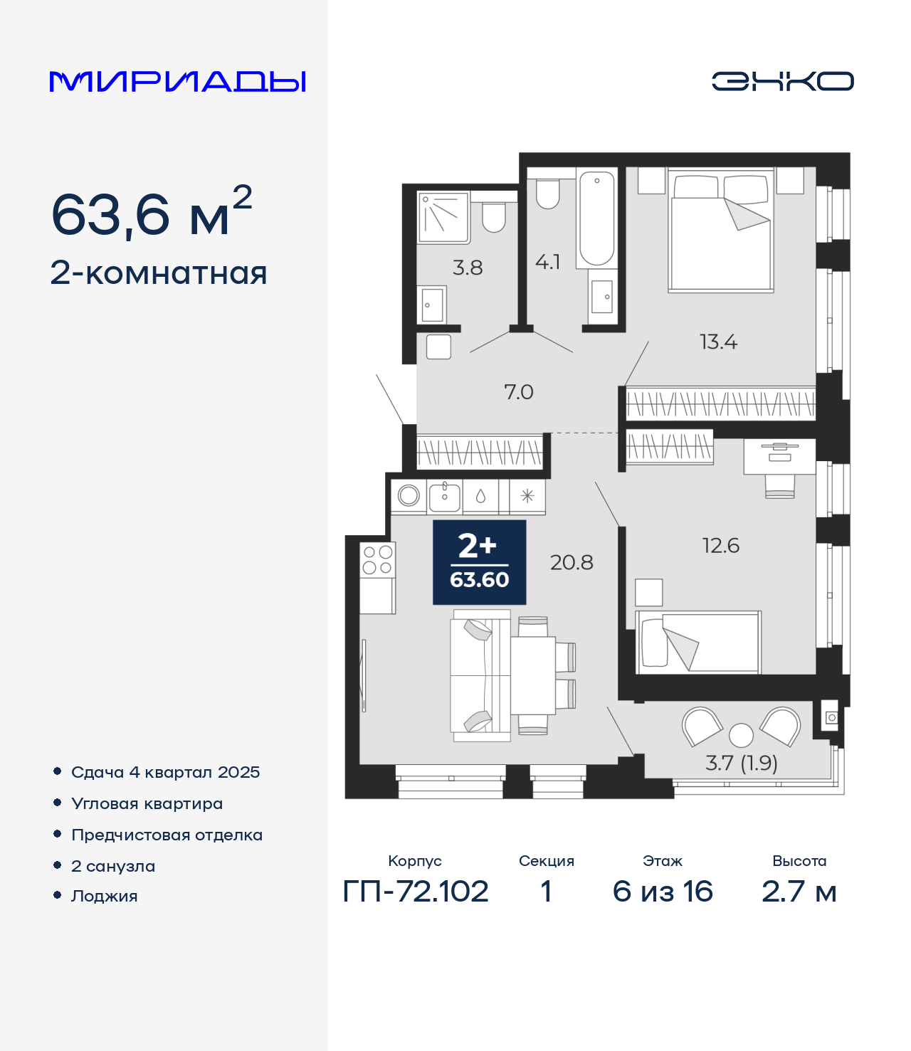 Двухкомнатная квартира от застройщика с предчистовой отделкой в ЖК "Мириады" на 6 этаже. Общая площадь: 63.6 кв.м., жилая: 26 кв.м., площадь просторной кухни-столовой: 20.8 кв.м. Квартира угловая, очень светлая, естественная вентиляция при открытии окон. В квартире одна лоджия, два совмещенных санузла. Высота потолков 2.7 м. Дом монолитный, многоподъездный, переменной этажности, от 14 до 16 этажей. Квартира находится в 1-й секции высотой 16 этажей в корпусе ГП-72.102. На этаже 9 квартир. В подъезде 1 пассажирский и 1 грузовой лифт. Окончание строительства - 4 квартал 2025 года. Оформление сделки по договору долевого участия. Вселенная бесконечных историй. Ранее невиданный Тюмени масштаб: территория 240 гектаров и 1 650 000 м² застройки. Мириады – это город масштабных перемен и больших возможностей. Город зеленых рощ и зеркальных озер. Город для работы, учебы и развлечений. Город для детей и их родителей. Город для всех и каждого. Проект расположен в районе Мыс рядом с ТРЦ «Тюмень Сити Молл» в границах улицы Тимофея Чаркова, Тобольского тракта и объездной дороги. Срок полного освоения территории - до 2034 года. (AQID02522735)