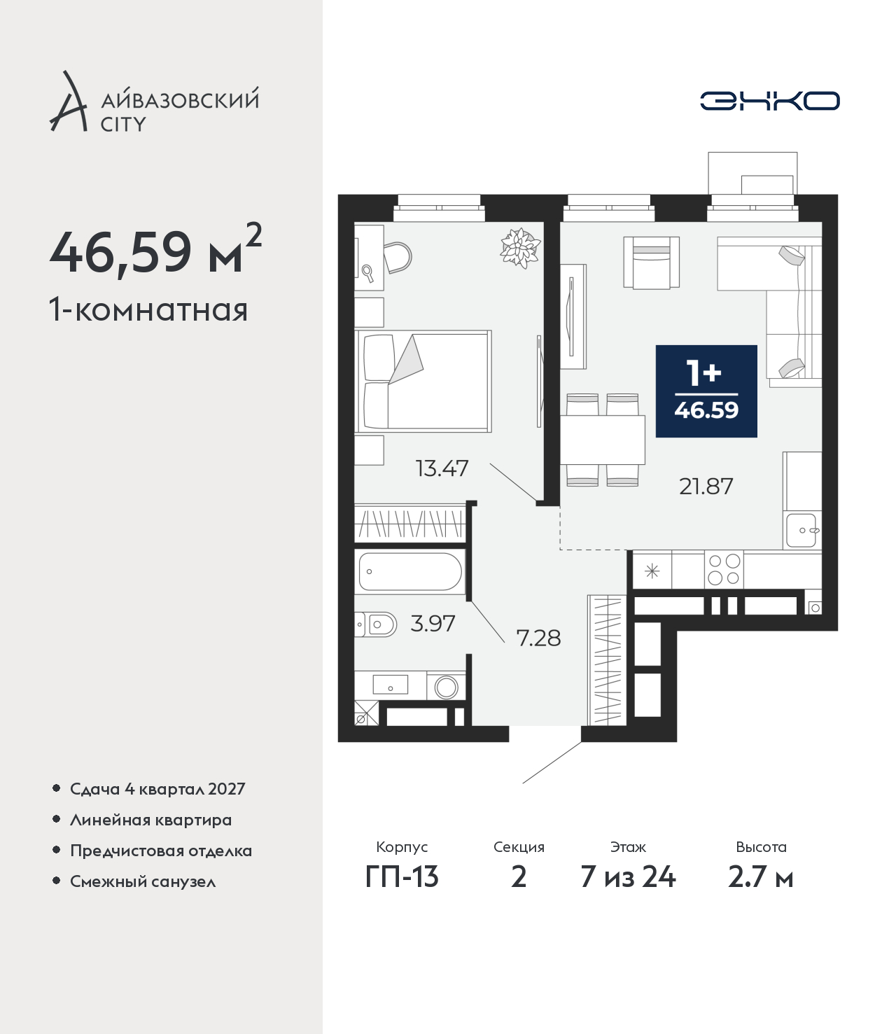 Просторная однокомнатная квартира с предчистовой отделкой в ЖК "Айвазовский City" на 7 этаже. Общая площадь: 46.59 кв.м., жилая: 13.47 кв.м., площадь просторной кухни-столовой: 21.87 кв.м. Все окна выходят на одну сторону. В квартире один совмещенный санузел. Высота потолков 2.7 м. Дом монолитный, многоподъездный, высотой 24 этажа. Квартира находится во 2-й секции в корпусе ГП-13. На этаже 6 квартир. В подъезде 1 пассажирский и 1 грузовой лифт. Окончание строительства - 4 квартал 2027 года. Оформление сделки по договору долевого участия. Новый жилой район располагается в живописном месте на берегу Туры в центральной части города. Принципиально новое пространство для жизни в центре современного города для тех, чьи мечты сбываются, кто нацелен на постоянный рост, перемены к лучшему для себя и своих близких. Каждая деталь Айвазовский City вдохновляет и заряжает на новые свершения: авторская архитектура, сбалансированная продуманная инфраструктура, дизайнерские дворы со спортивными и детскими площадками, парковые зоны с фонтанами, водный канал, украшающий центральный прогулочный маршрут района и многое другое. В 2019 года проект стал лауреатом престижной премии Urban Awards 2019 в номинации «Лучший строящийся региональный жилой комплекс бизнес-класса». Главная особенность Айвазовский City - соседство разных архитектурных школ в рамках одного дома. Изысканная классика, выразительная эклектика и оригинальный модерн - жить в одном из таких домов настоящий повод для гордости. Айвазовский City это идеальное сочетание комфорта, технологий и развитой инфраструктуры. Вход в подъезд возможен с улицы и со двора. Отправляясь на работу или за покупками, жители могут выйти с внешней стороны дома, а для прогулки с ребенком – со стороны двора. Экологически чистые материалы и энергосберегающие технологии, качественное освещение общественных зон, видеонаблюдение по всей территории жилого района (в том числе в подъездах, лифтах и в подземном паркинге), закрытые дворы с доступом только для жителей Айвазовский City. Часть домов в Айвазовский City будут оснащены подземным паркингом. Востребованный в нашем климатическом поясе формат хранения автомобилей защитит собственность владельца в любое время года. Аккредитация в банках: ОАО «Альфа-Банк», ПАО Банк «ВТБ», ПАО «Газпромбанк», «Сбербанк России», АО "ДОМ.РФ" и других. (AQID02525619)