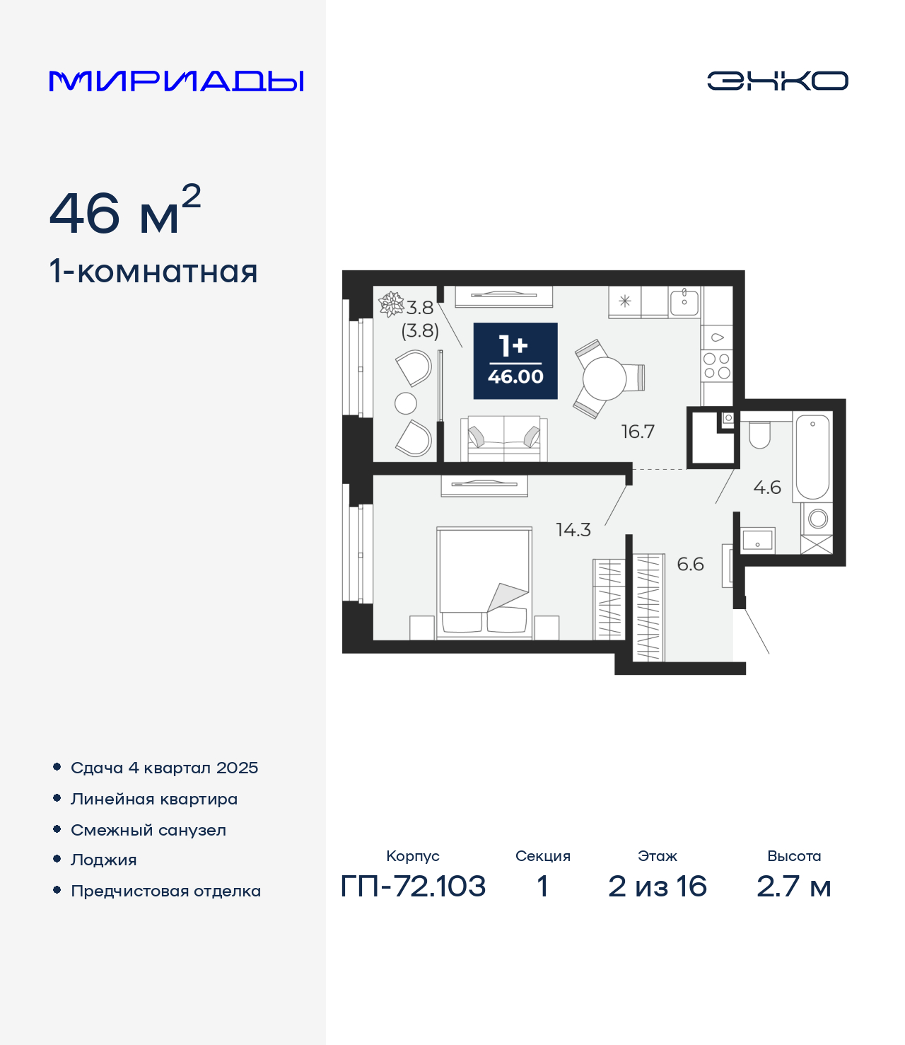 Просторная 1-комн. квартира с предчистовой отделкой в ЖК "Мириады" на 2 этаже. Общая площадь: 46 кв.м., жилая: 14.3 кв.м., площадь просторной кухни-столовой: 16.7 кв.м. Все окна выходят на одну сторону. В квартире одна лоджия, один совмещенный санузел. Высота потолков 2.7 м. Дом монолитный, трехподъездный, переменной этажности, от 14 до 16 этажей. Квартира находится в 1-й секции высотой 16 этажей в корпусе ГП-72.103. На этаже 8 квартир. В подъезде 1 пассажирский и 1 грузовой лифт. Окончание строительства - 4 квартал 2025 года. Оформление сделки по договору долевого участия. Вселенная бесконечных историй. Ранее невиданный Тюмени масштаб: территория 240 гектаров и 1 650 000 м² застройки. Мириады – это город масштабных перемен и больших возможностей. Город зеленых рощ и зеркальных озер. Город для работы, учебы и развлечений. Город для детей и их родителей. Город для всех и каждого. Проект расположен в районе Мыс рядом с ТРЦ «Тюмень Сити Молл» в границах улицы Тимофея Чаркова, Тобольского тракта и объездной дороги. Срок полного освоения территории - до 2034 года. (AQID02526970)