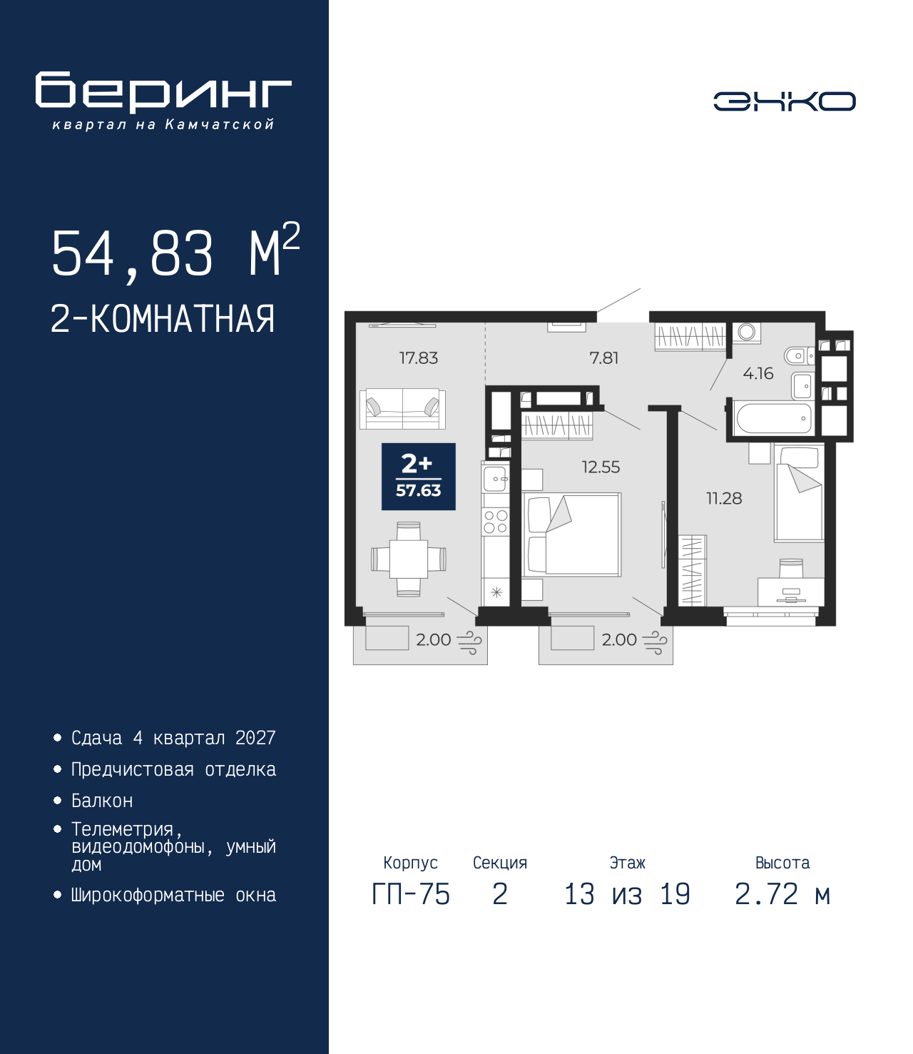 Продается 2-комн. квартира с предчистовой отделкой в ЖК "Беринг" на 13 этаже. Общая площадь: 54.83 кв.м., жилая: 23.83 кв.м., площадь просторной кухни-столовой: 17.83 кв.м. Комнаты изолированные, все окна выходят на одну сторону. В квартире два балкона, один совмещенный санузел. Высота потолков 2.72 м. Дом монолитный, многоподъездный, переменной этажности, от 17 до 24 этажей. Квартира находится во 2-й секции высотой 19 этажей в корпусе ГП-75. На этаже 7 квартир. В подъезде 2 пассажирских и 1 грузовой лифт. Окончание строительства - 4 квартал 2027 года. Оформление сделки по договору долевого участия. Подобно знаменитому исследователю, мы чувствуем себя первооткрывателями этой локации. Хотим показать новую суть места, сформировать для вас жизненный опыт, которого ещё не было. Беринг — район зелёного цвета. Беринг — район, который откроется вам с другой стороны. Впечатлит новым уровнем комфорта и качеством жизни. Беринг — открытие на карте города. Первый квартал расположен в районе Тура, в границах улиц: Камчатская – Западносибирская – Энтузиастов. Вокруг уже есть всё для того, чтобы ежедневная рутина была лишь частью жизни и не доставляла дискомфорта. Школы и детские сады, магазины и аптеки, поликлиника, места для семейного отдыха, пеших и велопрогулок, и даже рыбалки. Масштабное озеленение дворов — визитная карточка ЭНКО и ваш оазис спокойствия, чтобы отвлечься от повседневности. Раскидистые деревья, кустарники, травы и цветы — осталось остановиться, вдохнуть и расслабиться, глядя на эту природную красоту. Стилистика подъездов продолжает концепцию Беринга, вдохновлённого Камчаткой: сдержанный, но при этом впечатляющий дизайн соседствует с удобством и функциональностью. (AQID02529679)