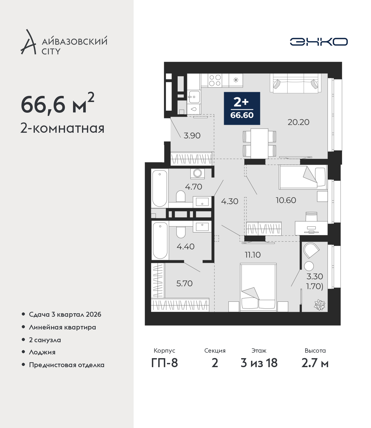 - Общая площадь 66.6 м²