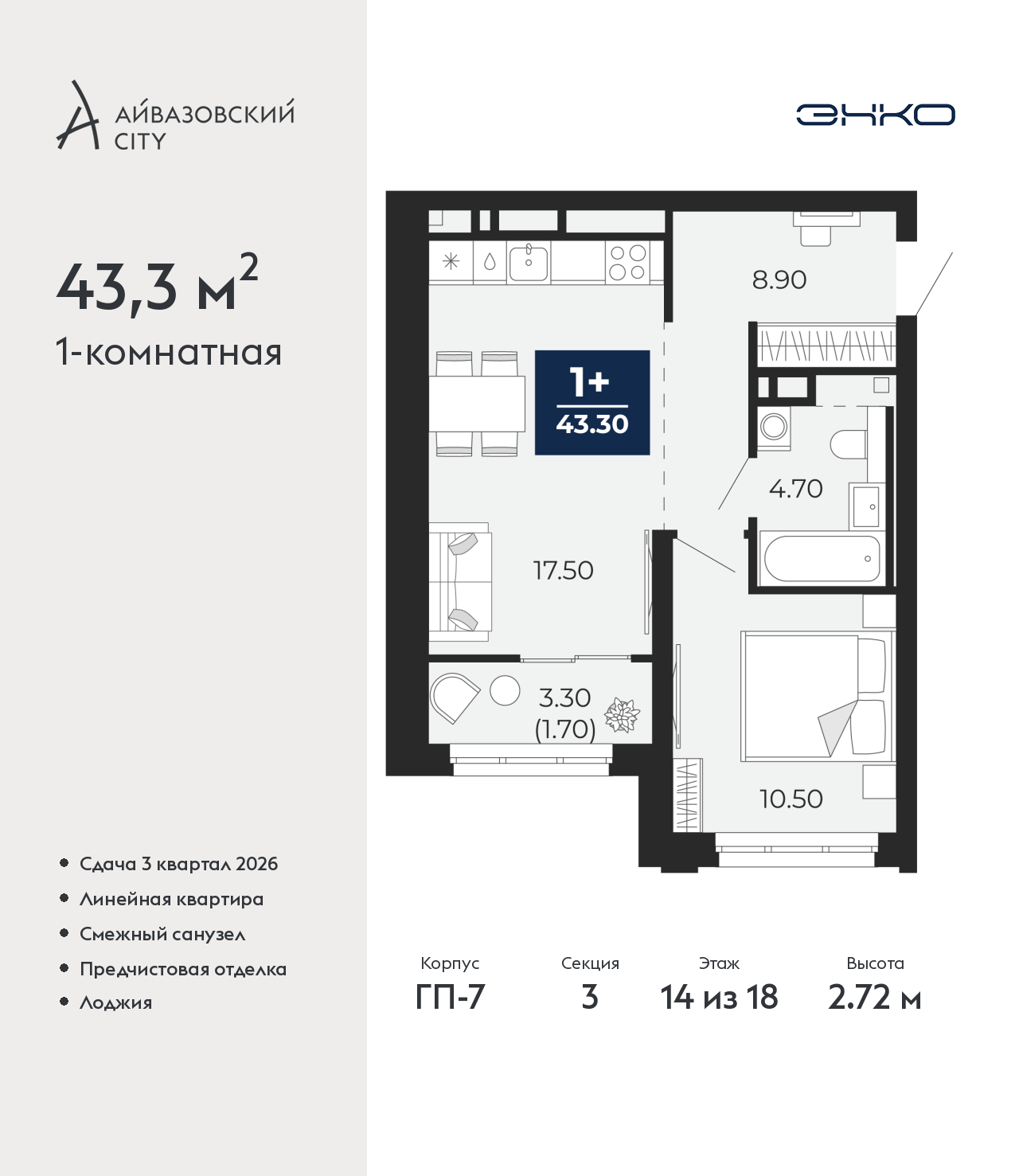 1-комн. квартира с предчистовой отделкой в ЖК "Айвазовский City" на 14 этаже. Общая площадь: 43.3 кв.м., жилая: 10.5 кв.м., площадь просторной кухни-столовой: 17.5 кв.м. Все окна выходят на одну сторону. В квартире одна лоджия, один совмещенный санузел. Высота потолков 2.72 м. Дом монолитный, многоподъездный, переменной этажности, от 9 до 24 этажей. Квартира находится в 3-й секции высотой 18 этажей в корпусе ГП-7. На этаже 5 квартир. В подъезде 1 пассажирский и 2 грузовых лифта. Окончание строительства - 3 квартал 2026 года. Оформление сделки по договору долевого участия. Новый жилой район располагается в живописном месте на берегу Туры в центральной части города. Принципиально новое пространство для жизни в центре современного города для тех, чьи мечты сбываются, кто нацелен на постоянный рост, перемены к лучшему для себя и своих близких. Каждая деталь Айвазовский City вдохновляет и заряжает на новые свершения: авторская архитектура, сбалансированная продуманная инфраструктура, дизайнерские дворы со спортивными и детскими площадками, парковые зоны с фонтанами, водный канал, украшающий центральный прогулочный маршрут района и многое другое. В 2019 года проект стал лауреатом престижной премии Urban Awards 2019 в номинации «Лучший строящийся региональный жилой комплекс бизнес-класса». Главная особенность Айвазовский City - соседство разных архитектурных школ в рамках одного дома. Изысканная классика, выразительная эклектика и оригинальный модерн - жить в одном из таких домов настоящий повод для гордости. Айвазовский City это идеальное сочетание комфорта, технологий и развитой инфраструктуры. Вход в подъезд возможен с улицы и со двора. Отправляясь на работу или за покупками, жители могут выйти с внешней стороны дома, а для прогулки с ребенком – со стороны двора. Экологически чистые материалы и энергосберегающие технологии, качественное освещение общественных зон, видеонаблюдение по всей территории жилого района (в том числе в подъездах, лифтах и в подземном паркинге), закрытые дворы с доступом только для жителей Айвазовский City. Часть домов в Айвазовский City будут оснащены подземным паркингом. Востребованный в нашем климатическом поясе формат хранения автомобилей защитит собственность владельца в любое время года. Аккредитация в банках: ПАО «Газпромбанк», «Сбербанк России», ОАО «Альфа-Банк», ПАО Банк «ВТБ», АО "ДОМ.РФ" и других. (AQID02497753)