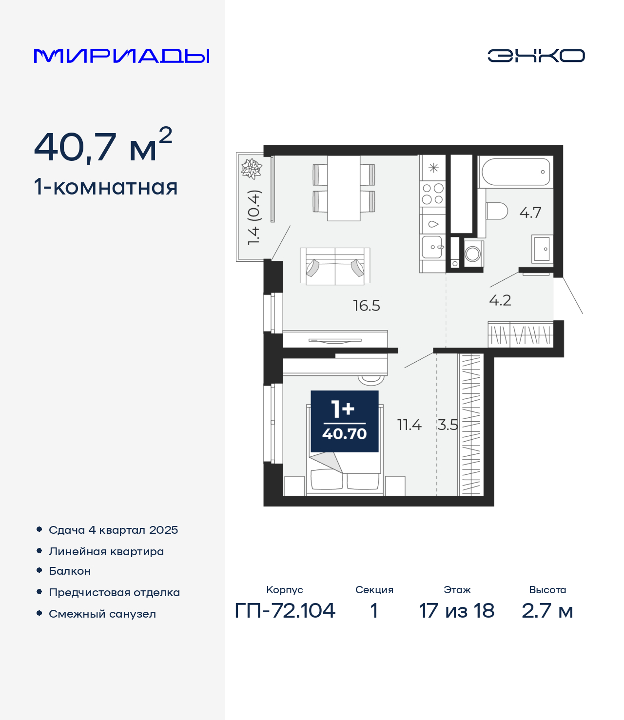 Однокомнатная квартира от застройщика с предчистовой отделкой в ЖК "Мириады" на 17 этаже. Общая площадь: 40.7 кв.м., жилая: 11.4 кв.м., площадь просторной кухни-столовой: 16.5 кв.м. Все окна выходят на одну сторону. В квартире один балкон, один совмещенный санузел. Высота потолков 2.7 м. Дом монолитный, двухподъездный, переменной этажности, от 14 до 18 этажей. Квартира находится в 1-й секции высотой 18 этажей в корпусе ГП-72.104. На этаже 6 квартир. В подъезде 1 пассажирский и 1 грузовой лифт. Окончание строительства - 4 квартал 2025 года. Оформление сделки по договору долевого участия. Вселенная бесконечных историй. Ранее невиданный Тюмени масштаб: территория 240 гектаров и 1 650 000 м² застройки. Мириады – это город масштабных перемен и больших возможностей. Город зеленых рощ и зеркальных озер. Город для работы, учебы и развлечений. Город для детей и их родителей. Город для всех и каждого. Проект расположен в районе Мыс рядом с ТРЦ «Тюмень Сити Молл» в границах улицы Тимофея Чаркова, Тобольского тракта и объездной дороги. Срок полного освоения территории - до 2034 года. (AQID02522771)