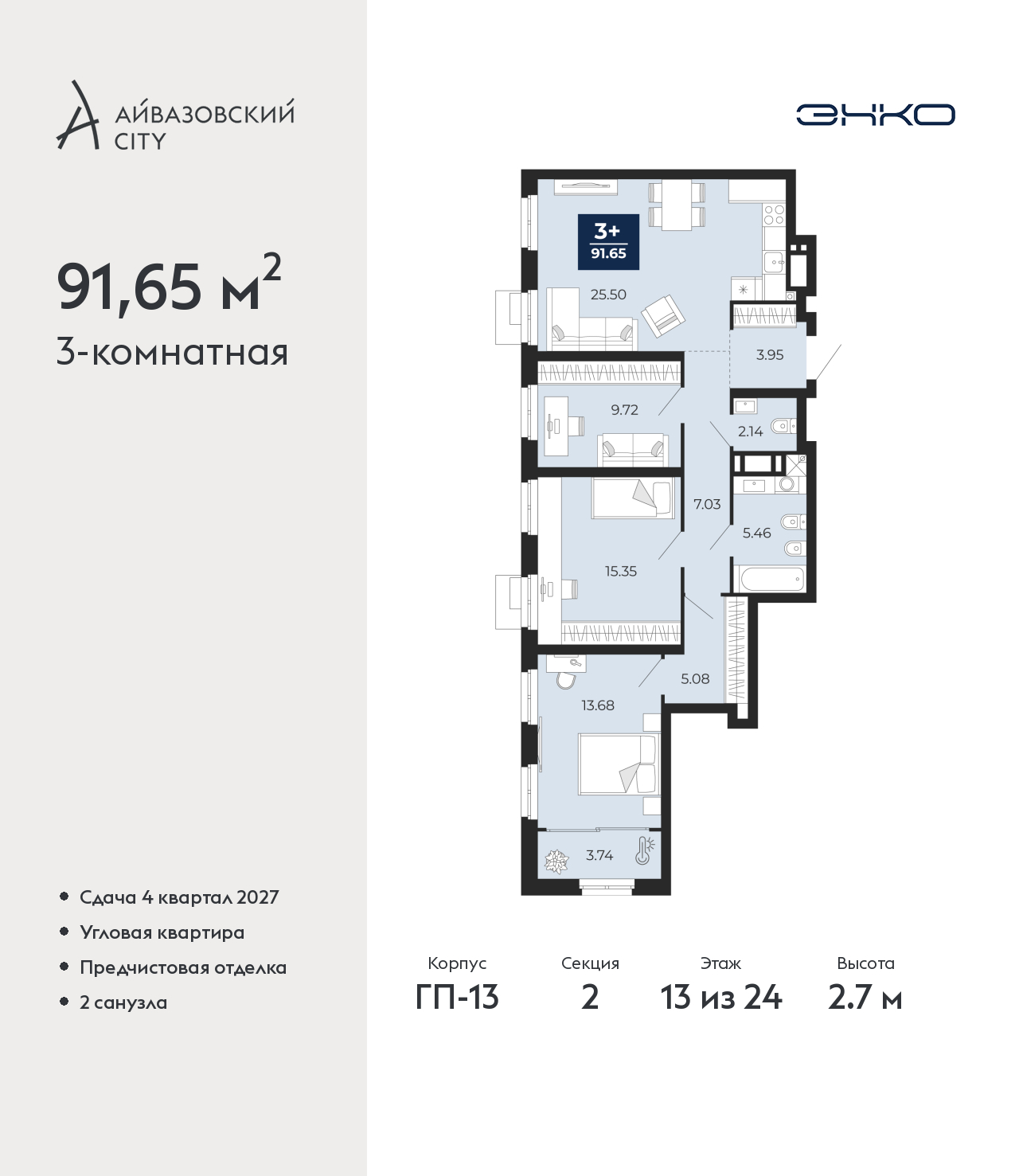 3-комн. квартира с предчистовой отделкой в ЖК "Айвазовский City" на 13 этаже. Общая площадь: 91.65 кв.м., жилая: 38.75 кв.м., площадь просторной кухни-столовой: 25.5 кв.м. Угловая квартира, очень светлая, естественная вентиляция при открытии окон. В квартире один совмещенный и один раздельный санузел. Высота потолков 2.7 м. Дом монолитный, многоподъездный, высотой 24 этажа. Квартира находится во 2-й секции в корпусе ГП-13. На этаже 6 квартир. В подъезде 1 пассажирский и 1 грузовой лифт. Окончание строительства - 4 квартал 2027 года. Оформление сделки по договору долевого участия. Новый жилой район располагается в живописном месте на берегу Туры в центральной части города. Принципиально новое пространство для жизни в центре современного города для тех, чьи мечты сбываются, кто нацелен на постоянный рост, перемены к лучшему для себя и своих близких. Каждая деталь Айвазовский City вдохновляет и заряжает на новые свершения: авторская архитектура, сбалансированная продуманная инфраструктура, дизайнерские дворы со спортивными и детскими площадками, парковые зоны с фонтанами, водный канал, украшающий центральный прогулочный маршрут района и многое другое. В 2019 года проект стал лауреатом престижной премии Urban Awards 2019 в номинации «Лучший строящийся региональный жилой комплекс бизнес-класса». Главная особенность Айвазовский City - соседство разных архитектурных школ в рамках одного дома. Изысканная классика, выразительная эклектика и оригинальный модерн - жить в одном из таких домов настоящий повод для гордости. Айвазовский City это идеальное сочетание комфорта, технологий и развитой инфраструктуры. Вход в подъезд возможен с улицы и со двора. Отправляясь на работу или за покупками, жители могут выйти с внешней стороны дома, а для прогулки с ребенком – со стороны двора. Экологически чистые материалы и энергосберегающие технологии, качественное освещение общественных зон, видеонаблюдение по всей территории жилого района (в том числе в подъездах, лифтах и в подземном паркинге), закрытые дворы с доступом только для жителей Айвазовский City. Часть домов в Айвазовский City будут оснащены подземным паркингом. Востребованный в нашем климатическом поясе формат хранения автомобилей защитит собственность владельца в любое время года. Аккредитация в банках: «Сбербанк России», ОАО «Альфа-Банк», ПАО «Газпромбанк», ПАО Банк «ВТБ», АО "ДОМ.РФ" и других. (AQID02525760)