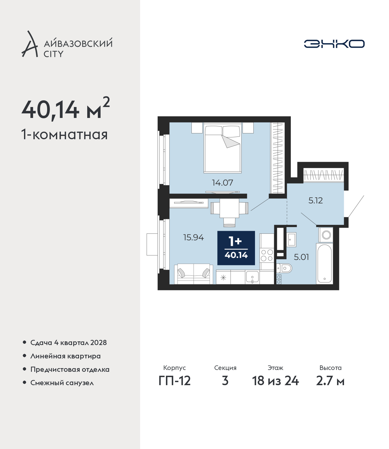Продается 1-комн. квартира с предчистовой отделкой в ЖК "Айвазовский City" на 18 этаже. Общая площадь: 40.14 кв.м., жилая: 14.07 кв.м., площадь просторной кухни-столовой: 15.94 кв.м. Все окна выходят на одну сторону. В квартире один совмещенный санузел. Высота потолков 2.7 м. Дом монолитный, многоподъездный, высотой 24 этажа. Квартира находится в 3-й секции в корпусе ГП-12. На этаже 6 квартир. В подъезде 1 пассажирский и 1 грузовой лифт. Окончание строительства - 4 квартал 2028 года. Оформление сделки по договору долевого участия. Новый жилой район располагается в живописном месте на берегу Туры в центральной части города. Принципиально новое пространство для жизни в центре современного города для тех, чьи мечты сбываются, кто нацелен на постоянный рост, перемены к лучшему для себя и своих близких. Каждая деталь Айвазовский City вдохновляет и заряжает на новые свершения: авторская архитектура, сбалансированная продуманная инфраструктура, дизайнерские дворы со спортивными и детскими площадками, парковые зоны с фонтанами, водный канал, украшающий центральный прогулочный маршрут района и многое другое. В 2019 года проект стал лауреатом престижной премии Urban Awards 2019 в номинации «Лучший строящийся региональный жилой комплекс бизнес-класса». Главная особенность Айвазовский City - соседство разных архитектурных школ в рамках одного дома. Изысканная классика, выразительная эклектика и оригинальный модерн - жить в одном из таких домов настоящий повод для гордости. Айвазовский City это идеальное сочетание комфорта, технологий и развитой инфраструктуры. Вход в подъезд возможен с улицы и со двора. Отправляясь на работу или за покупками, жители могут выйти с внешней стороны дома, а для прогулки с ребенком – со стороны двора. Экологически чистые материалы и энергосберегающие технологии, качественное освещение общественных зон, видеонаблюдение по всей территории жилого района (в том числе в подъездах, лифтах и в подземном паркинге), закрытые дворы с доступом только для жителей Айвазовский City. Часть домов в Айвазовский City будут оснащены подземным паркингом. Востребованный в нашем климатическом поясе формат хранения автомобилей защитит собственность владельца в любое время года. Аккредитация в банках: «Сбербанк России», ПАО Банк «ВТБ», ПАО «Газпромбанк», ОАО «Альфа-Банк», ПАО «Совкомбанк» и других. (AQID02525586)