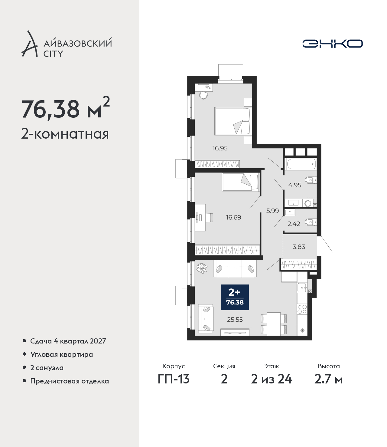 Просторная 2-комн. квартира с предчистовой отделкой в ЖК "Айвазовский City" на 2 этаже. Общая площадь: 76.38 кв.м., жилая: 33.64 кв.м., площадь просторной кухни-столовой: 25.55 кв.м. Угловая квартира, окна oбecпeчивaют paвнoмepнoe ocвeщeниe в тeчeниe дня. В квартире один совмещенный и один раздельный санузел. Высота потолков 2.7 м. Дом монолитный, многоподъездный, высотой 24 этажа. Квартира находится во 2-й секции в корпусе ГП-13. На этаже 6 квартир. В подъезде 1 пассажирский и 1 грузовой лифт. Окончание строительства - 4 квартал 2027 года. Оформление сделки по договору долевого участия. Новый жилой район располагается в живописном месте на берегу Туры в центральной части города. Принципиально новое пространство для жизни в центре современного города для тех, чьи мечты сбываются, кто нацелен на постоянный рост, перемены к лучшему для себя и своих близких. Каждая деталь Айвазовский City вдохновляет и заряжает на новые свершения: авторская архитектура, сбалансированная продуманная инфраструктура, дизайнерские дворы со спортивными и детскими площадками, парковые зоны с фонтанами, водный канал, украшающий центральный прогулочный маршрут района и многое другое. В 2019 года проект стал лауреатом престижной премии Urban Awards 2019 в номинации «Лучший строящийся региональный жилой комплекс бизнес-класса». Главная особенность Айвазовский City - соседство разных архитектурных школ в рамках одного дома. Изысканная классика, выразительная эклектика и оригинальный модерн - жить в одном из таких домов настоящий повод для гордости. Айвазовский City это идеальное сочетание комфорта, технологий и развитой инфраструктуры. Вход в подъезд возможен с улицы и со двора. Отправляясь на работу или за покупками, жители могут выйти с внешней стороны дома, а для прогулки с ребенком – со стороны двора. Экологически чистые материалы и энергосберегающие технологии, качественное освещение общественных зон, видеонаблюдение по всей территории жилого района (в том числе в подъездах, лифтах и в подземном паркинге), закрытые дворы с доступом только для жителей Айвазовский City. Часть домов в Айвазовский City будут оснащены подземным паркингом. Востребованный в нашем климатическом поясе формат хранения автомобилей защитит собственность владельца в любое время года. Аккредитация в банках: ПАО «Газпромбанк», ОАО «Альфа-Банк», «Сбербанк России», ПАО Банк «ВТБ», ПАО «Совкомбанк» и других. (AQID02525712)