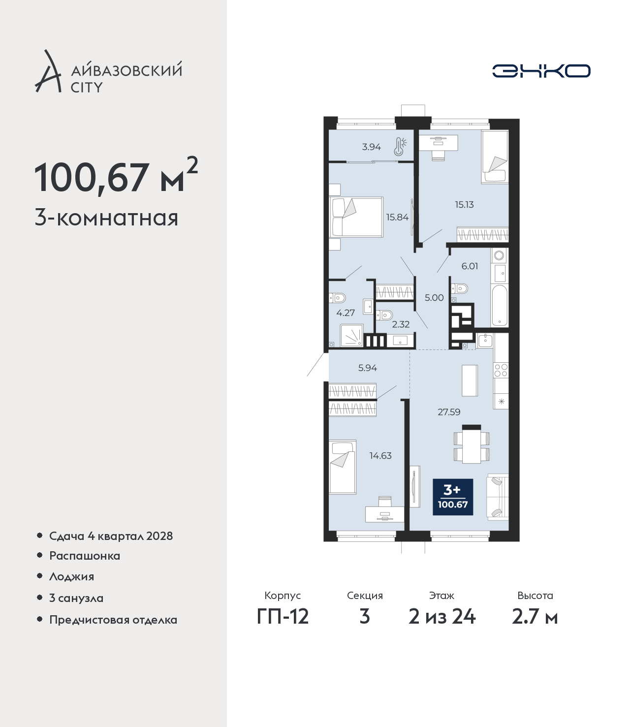 Трехкомнатная квартира от застройщика с предчистовой отделкой в ЖК "Айвазовский City" на 2 этаже. Общая площадь: 100.67 кв.м., жилая: 45.6 кв.м., площадь просторной кухни-столовой: 27.59 кв.м. Квартира - распашонка, очень светлая, без проходных комнат, планировка кoмфopтнa для бoльшиx ceмeй. В квартире одна лоджия, два совмещенных и один раздельный санузел. Высота потолков 2.7 м. Дом монолитный, многоподъездный, высотой 24 этажа. Квартира находится в 3-й секции в корпусе ГП-12. На этаже 6 квартир. В подъезде 1 пассажирский и 1 грузовой лифт. Окончание строительства - 4 квартал 2028 года. Оформление сделки по договору долевого участия. Новый жилой район располагается в живописном месте на берегу Туры в центральной части города. Принципиально новое пространство для жизни в центре современного города для тех, чьи мечты сбываются, кто нацелен на постоянный рост, перемены к лучшему для себя и своих близких. Каждая деталь Айвазовский City вдохновляет и заряжает на новые свершения: авторская архитектура, сбалансированная продуманная инфраструктура, дизайнерские дворы со спортивными и детскими площадками, парковые зоны с фонтанами, водный канал, украшающий центральный прогулочный маршрут района и многое другое. В 2019 года проект стал лауреатом престижной премии Urban Awards 2019 в номинации «Лучший строящийся региональный жилой комплекс бизнес-класса». Главная особенность Айвазовский City - соседство разных архитектурных школ в рамках одного дома. Изысканная классика, выразительная эклектика и оригинальный модерн - жить в одном из таких домов настоящий повод для гордости. Айвазовский City это идеальное сочетание комфорта, технологий и развитой инфраструктуры. Вход в подъезд возможен с улицы и со двора. Отправляясь на работу или за покупками, жители могут выйти с внешней стороны дома, а для прогулки с ребенком – со стороны двора. Экологически чистые материалы и энергосберегающие технологии, качественное освещение общественных зон, видеонаблюдение по всей территории жилого района (в том числе в подъездах, лифтах и в подземном паркинге), закрытые дворы с доступом только для жителей Айвазовский City. Часть домов в Айвазовский City будут оснащены подземным паркингом. Востребованный в нашем климатическом поясе формат хранения автомобилей защитит собственность владельца в любое время года. Аккредитация в банках: ПАО «Газпромбанк», ПАО Банк «ВТБ», ОАО «Альфа-Банк», «Сбербанк России», ПАО «Совкомбанк» и других. (AQID02525761)