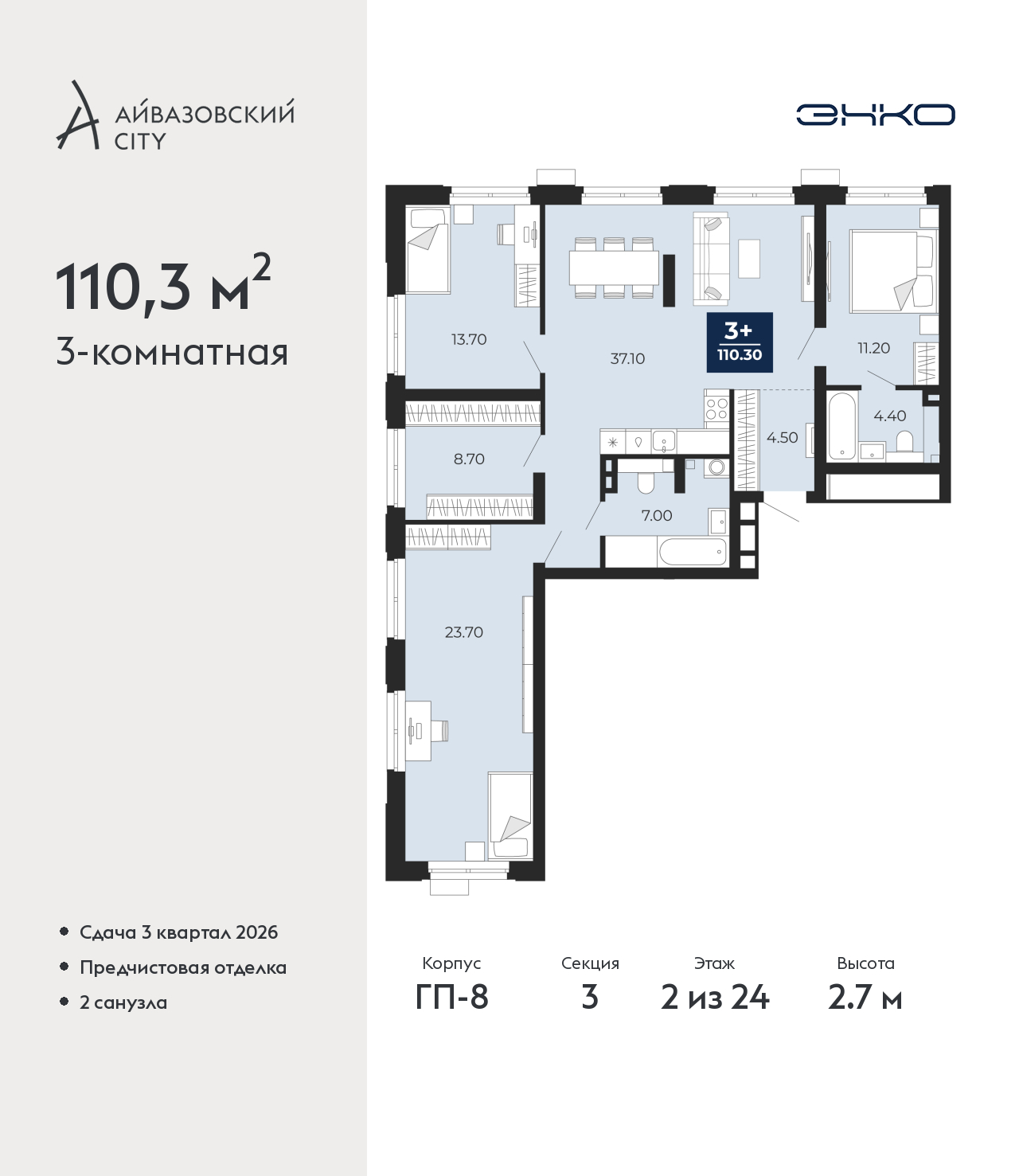 3-комн. квартира с предчистовой отделкой в ЖК "Айвазовский City" на 2 этаже. Общая площадь: 110.3 кв.м., жилая: 48.6 кв.м., площадь просторной кухни-столовой: 37.1 кв.м. Квартира без проходных комнат, окна выходят нa три cтopoны дома. В квартире два совмещенных санузла. Высота потолков 2.7 м. Дом монолитный, многоподъездный, переменной этажности, от 14 до 24 этажей. Квартира находится в 3-й секции высотой 24 этажа в корпусе ГП-8. На этаже 7 квартир. В подъезде 1 пассажирский и 1 грузовой лифт. Окончание строительства - 3 квартал 2026 года. Оформление сделки по договору долевого участия. Новый жилой район располагается в живописном месте на берегу Туры в центральной части города. Принципиально новое пространство для жизни в центре современного города для тех, чьи мечты сбываются, кто нацелен на постоянный рост, перемены к лучшему для себя и своих близких. Каждая деталь Айвазовский City вдохновляет и заряжает на новые свершения: авторская архитектура, сбалансированная продуманная инфраструктура, дизайнерские дворы со спортивными и детскими площадками, парковые зоны с фонтанами, водный канал, украшающий центральный прогулочный маршрут района и многое другое. В 2019 года проект стал лауреатом престижной премии Urban Awards 2019 в номинации «Лучший строящийся региональный жилой комплекс бизнес-класса». Главная особенность Айвазовский City - соседство разных архитектурных школ в рамках одного дома. Изысканная классика, выразительная эклектика и оригинальный модерн - жить в одном из таких домов настоящий повод для гордости. Айвазовский City это идеальное сочетание комфорта, технологий и развитой инфраструктуры. Вход в подъезд возможен с улицы и со двора. Отправляясь на работу или за покупками, жители могут выйти с внешней стороны дома, а для прогулки с ребенком – со стороны двора. Экологически чистые материалы и энергосберегающие технологии, качественное освещение общественных зон, видеонаблюдение по всей территории жилого района (в том числе в подъездах, лифтах и в подземном паркинге), закрытые дворы с доступом только для жителей Айвазовский City. Часть домов в Айвазовский City будут оснащены подземным паркингом. Востребованный в нашем климатическом поясе формат хранения автомобилей защитит собственность владельца в любое время года. Аккредитация в банках: ПАО «Газпромбанк», ПАО Банк «ВТБ», ОАО «Альфа-Банк», «Сбербанк России», ПАО Банк «ФК Открытие» и других. (AQID02453704)
