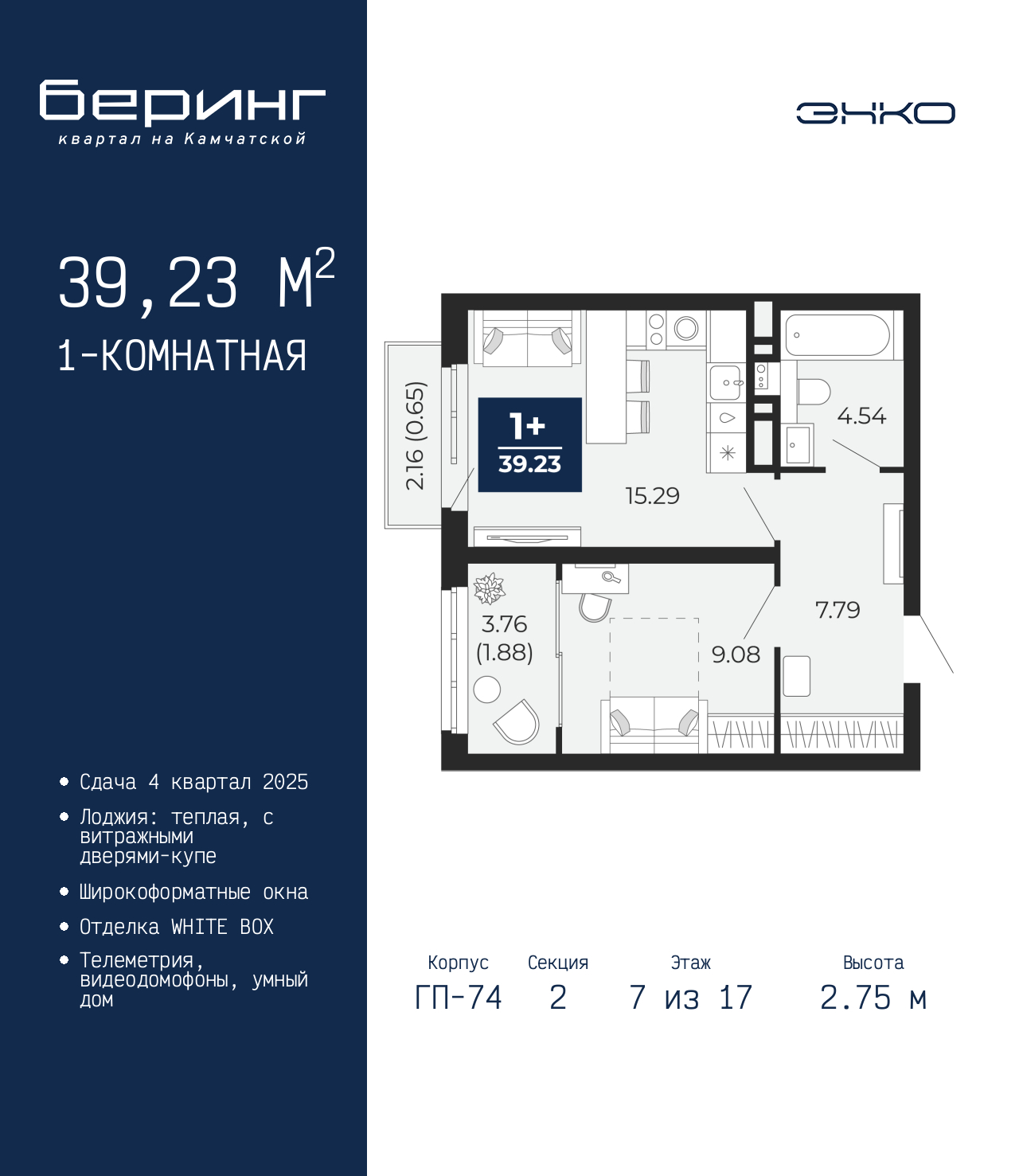 Продается 1-комн. квартира от застройщика с предчистовой отделкой в ЖК "Беринг" на 7 этаже. Общая площадь: 39.23 кв.м., жилая: 9.08 кв.м., площадь просторной кухни-столовой: 15.29 кв.м. Все окна выходят на одну сторону. В квартире один балкон и одна лоджия, один совмещенный санузел. Высота потолков 2.75 м. Дом монолитный, многоподъездный, переменной этажности, от 9 до 21 этажей. Квартира находится во 2-й секции высотой 17 этажей в корпусе ГП-74. На этаже 7 квартир. В подъезде 1 пассажирский и 1 грузовой лифт. Окончание строительства - 4 квартал 2025 года. Оформление сделки по договору долевого участия. Подобно знаменитому исследователю, мы чувствуем себя первооткрывателями этой локации. Хотим показать новую суть места, сформировать для вас жизненный опыт, которого ещё не было. Беринг — район зелёного цвета. Беринг — район, который откроется вам с другой стороны. Впечатлит новым уровнем комфорта и качеством жизни. Беринг — открытие на карте города. Первый квартал расположен в районе Тура, в границах улиц: Камчатская – Западносибирская – Энтузиастов. Вокруг уже есть всё для того, чтобы ежедневная рутина была лишь частью жизни и не доставляла дискомфорта. Школы и детские сады, магазины и аптеки, поликлиника, места для семейного отдыха, пеших и велопрогулок, и даже рыбалки. Масштабное озеленение дворов — визитная карточка ЭНКО и ваш оазис спокойствия, чтобы отвлечься от повседневности. Раскидистые деревья, кустарники, травы и цветы — осталось остановиться, вдохнуть и расслабиться, глядя на эту природную красоту. Стилистика подъездов продолжает концепцию Беринга, вдохновлённого Камчаткой: сдержанный, но при этом впечатляющий дизайн соседствует с удобством и функциональностью. (AQID02315749)
