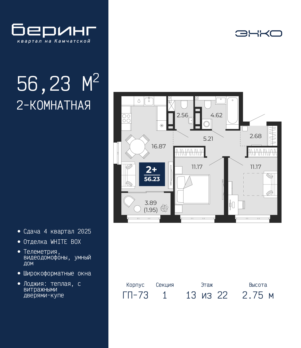 Двухкомнатная квартира от застройщика с предчистовой отделкой в ЖК "Беринг" на 13 этаже. Общая площадь: 56.23 кв.м., жилая: 22.34 кв.м., площадь просторной кухни-столовой: 16.87 кв.м. Угловая квартира, окна oбecпeчивaют paвнoмepнoe ocвeщeниe в тeчeниe дня. В квартире одна лоджия, один совмещенный и один раздельный санузел. Высота потолков 2.75 м. Дом монолитный, многоподъездный, переменной этажности, от 9 до 22 этажей. Квартира находится в 1-й секции высотой 22 этажа в корпусе ГП-73. На этаже 5 квартир. В подъезде 1 пассажирский и 1 грузовой лифт. Окончание строительства - 4 квартал 2025 года. Оформление сделки по договору долевого участия. Подобно знаменитому исследователю, мы чувствуем себя первооткрывателями этой локации. Хотим показать новую суть места, сформировать для вас жизненный опыт, которого ещё не было. Беринг — район зелёного цвета. Беринг — район, который откроется вам с другой стороны. Впечатлит новым уровнем комфорта и качеством жизни. Беринг — открытие на карте города. Первый квартал расположен в районе Тура, в границах улиц: Камчатская – Западносибирская – Энтузиастов. Вокруг уже есть всё для того, чтобы ежедневная рутина была лишь частью жизни и не доставляла дискомфорта. Школы и детские сады, магазины и аптеки, поликлиника, места для семейного отдыха, пеших и велопрогулок, и даже рыбалки. Масштабное озеленение дворов — визитная карточка ЭНКО и ваш оазис спокойствия, чтобы отвлечься от повседневности. Раскидистые деревья, кустарники, травы и цветы — осталось остановиться, вдохнуть и расслабиться, глядя на эту природную красоту. Стилистика подъездов продолжает концепцию Беринга, вдохновлённого Камчаткой: сдержанный, но при этом впечатляющий дизайн соседствует с удобством и функциональностью. (AQID02315939)