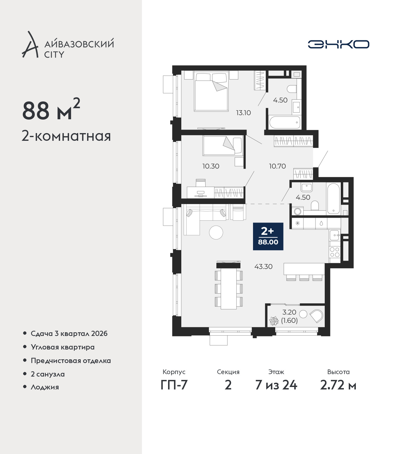 Двухкомнатная квартира с предчистовой отделкой в ЖК "Айвазовский City" на 7 этаже. Общая площадь: 88 кв.м., жилая: 23.4 кв.м., площадь просторной кухни-столовой: 43.3 кв.м. Квартира угловая, идеально подойдет любителям тишины и панорамных видов. В квартире одна лоджия, два совмещенных санузла. Высота потолков 2.72 м. Дом монолитный, многоподъездный, переменной этажности, от 9 до 24 этажей. Квартира находится во 2-й секции высотой 24 этажа в корпусе ГП-7. На этаже 7 квартир. В подъезде 1 пассажирский и 2 грузовых лифта. Окончание строительства - 3 квартал 2026 года. Оформление сделки по договору долевого участия. Новый жилой район располагается в живописном месте на берегу Туры в центральной части города. Принципиально новое пространство для жизни в центре современного города для тех, чьи мечты сбываются, кто нацелен на постоянный рост, перемены к лучшему для себя и своих близких. Каждая деталь Айвазовский City вдохновляет и заряжает на новые свершения: авторская архитектура, сбалансированная продуманная инфраструктура, дизайнерские дворы со спортивными и детскими площадками, парковые зоны с фонтанами, водный канал, украшающий центральный прогулочный маршрут района и многое другое. В 2019 года проект стал лауреатом престижной премии Urban Awards 2019 в номинации «Лучший строящийся региональный жилой комплекс бизнес-класса». Главная особенность Айвазовский City - соседство разных архитектурных школ в рамках одного дома. Изысканная классика, выразительная эклектика и оригинальный модерн - жить в одном из таких домов настоящий повод для гордости. Айвазовский City это идеальное сочетание комфорта, технологий и развитой инфраструктуры. Вход в подъезд возможен с улицы и со двора. Отправляясь на работу или за покупками, жители могут выйти с внешней стороны дома, а для прогулки с ребенком – со стороны двора. Экологически чистые материалы и энергосберегающие технологии, качественное освещение общественных зон, видеонаблюдение по всей территории жилого района (в том числе в подъездах, лифтах и в подземном паркинге), закрытые дворы с доступом только для жителей Айвазовский City. Часть домов в Айвазовский City будут оснащены подземным паркингом. Востребованный в нашем климатическом поясе формат хранения автомобилей защитит собственность владельца в любое время года. Аккредитация в банках: «Сбербанк России», ПАО «Газпромбанк», ПАО Банк «ВТБ», ОАО «Альфа-Банк», ПАО АКБ «Абсолют Банк» и других. (AQID02483574)