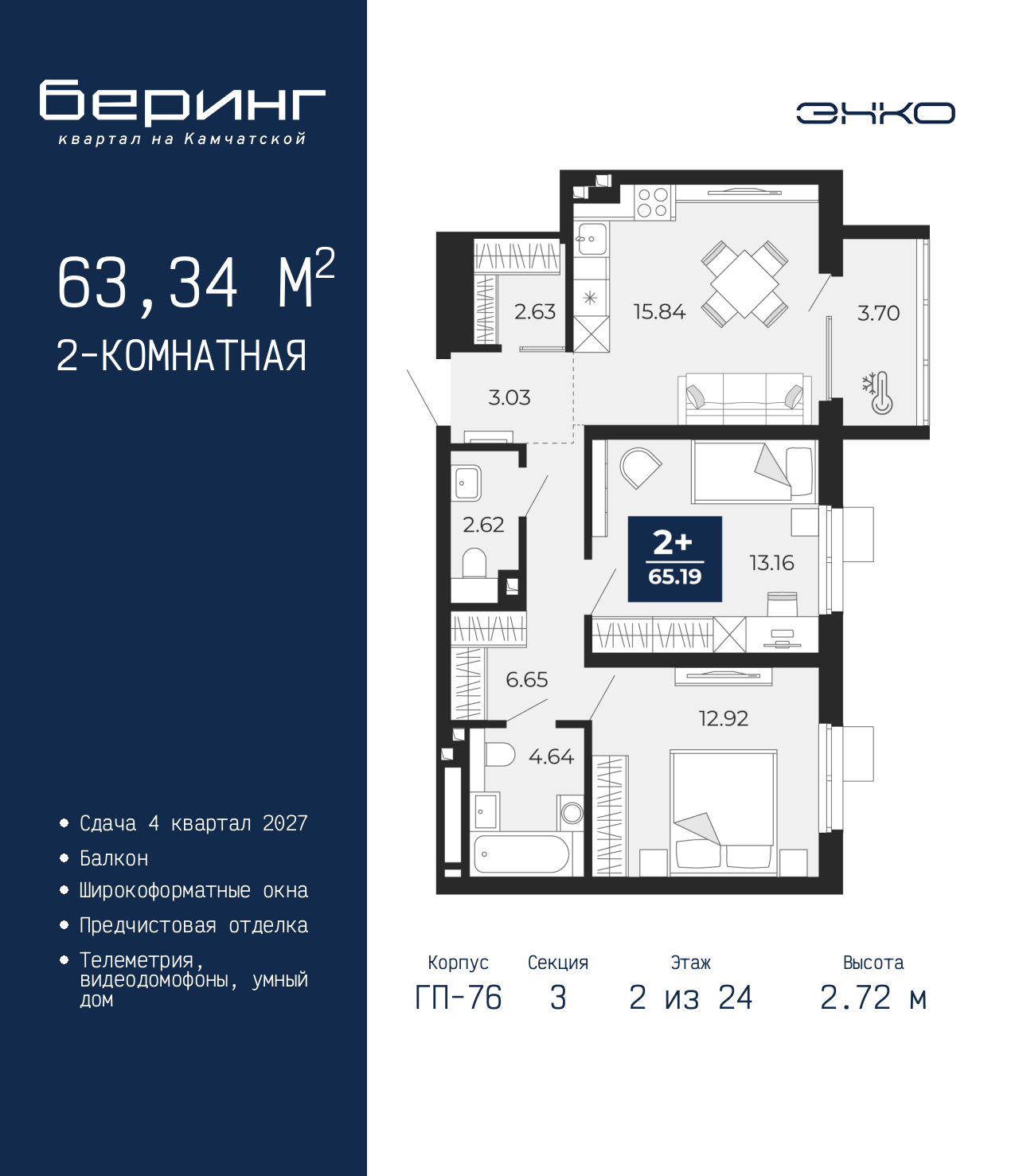 Просторная 2-комн. квартира с предчистовой отделкой в ЖК "Беринг" на 2 этаже. Общая площадь: 63.34 кв.м., жилая: 26.08 кв.м., площадь просторной кухни-столовой: 15.84 кв.м. Комнаты изолированные, все окна выходят на одну сторону. В квартире один балкон, один совмещенный и один раздельный санузел. Высота потолков 2.72 м. Дом монолитный, черырехподъездный, переменной этажности, от 19 до 24 этажей. Квартира находится в 3-й секции высотой 24 этажа в корпусе ГП-76. На этаже 6 квартир. В подъезде 1 пассажирский и 1 грузовой лифт. Окончание строительства - 4 квартал 2027 года. Оформление сделки по договору долевого участия. Подобно знаменитому исследователю, мы чувствуем себя первооткрывателями этой локации. Хотим показать новую суть места, сформировать для вас жизненный опыт, которого ещё не было. Беринг — район зелёного цвета. Беринг — район, который откроется вам с другой стороны. Впечатлит новым уровнем комфорта и качеством жизни. Беринг — открытие на карте города. Первый квартал расположен в районе Тура, в границах улиц: Камчатская – Западносибирская – Энтузиастов. Вокруг уже есть всё для того, чтобы ежедневная рутина была лишь частью жизни и не доставляла дискомфорта. Школы и детские сады, магазины и аптеки, поликлиника, места для семейного отдыха, пеших и велопрогулок, и даже рыбалки. Масштабное озеленение дворов — визитная карточка ЭНКО и ваш оазис спокойствия, чтобы отвлечься от повседневности. Раскидистые деревья, кустарники, травы и цветы — осталось остановиться, вдохнуть и расслабиться, глядя на эту природную красоту. Стилистика подъездов продолжает концепцию Беринга, вдохновлённого Камчаткой: сдержанный, но при этом впечатляющий дизайн соседствует с удобством и функциональностью. (AQID02529291)