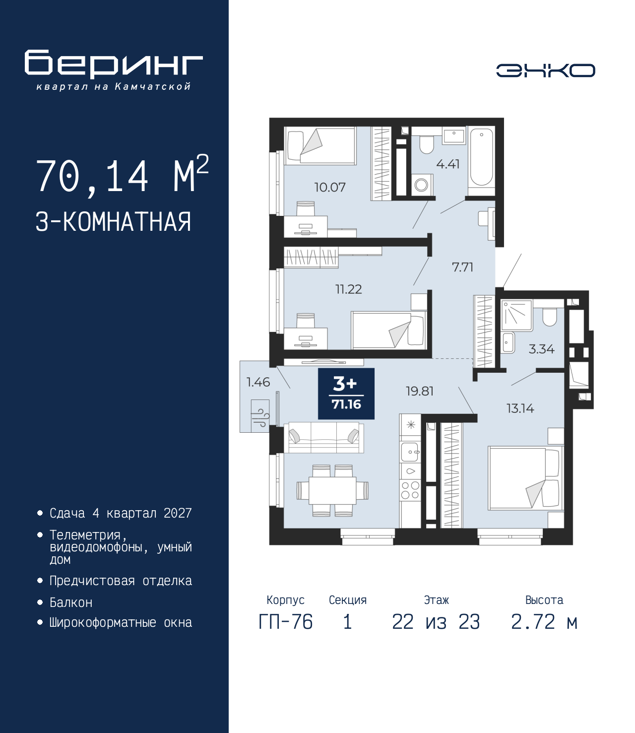 Просторная трехкомнатная квартира с предчистовой отделкой в ЖК "Беринг" на 22 этаже. Общая площадь: 70.14 кв.м., жилая: 34.43 кв.м., площадь просторной кухни-столовой: 19.81 кв.м. Квартира угловая, идеально подойдет любителям тишины и панорамных видов. В квартире один балкон, два совмещенных санузла. Высота потолков 2.72 м. Дом монолитный, черырехподъездный, переменной этажности, от 19 до 24 этажей. Квартира находится в 1-й секции высотой 23 этажа в корпусе ГП-76. На этаже 7 квартир. В подъезде 2 пассажирских и 1 грузовой лифт. Окончание строительства - 4 квартал 2027 года. Оформление сделки по договору долевого участия. Подобно знаменитому исследователю, мы чувствуем себя первооткрывателями этой локации. Хотим показать новую суть места, сформировать для вас жизненный опыт, которого ещё не было. Беринг — район зелёного цвета. Беринг — район, который откроется вам с другой стороны. Впечатлит новым уровнем комфорта и качеством жизни. Беринг — открытие на карте города. Первый квартал расположен в районе Тура, в границах улиц: Камчатская – Западносибирская – Энтузиастов. Вокруг уже есть всё для того, чтобы ежедневная рутина была лишь частью жизни и не доставляла дискомфорта. Школы и детские сады, магазины и аптеки, поликлиника, места для семейного отдыха, пеших и велопрогулок, и даже рыбалки. Масштабное озеленение дворов — визитная карточка ЭНКО и ваш оазис спокойствия, чтобы отвлечься от повседневности. Раскидистые деревья, кустарники, травы и цветы — осталось остановиться, вдохнуть и расслабиться, глядя на эту природную красоту. Стилистика подъездов продолжает концепцию Беринга, вдохновлённого Камчаткой: сдержанный, но при этом впечатляющий дизайн соседствует с удобством и функциональностью. (AQID02517953)