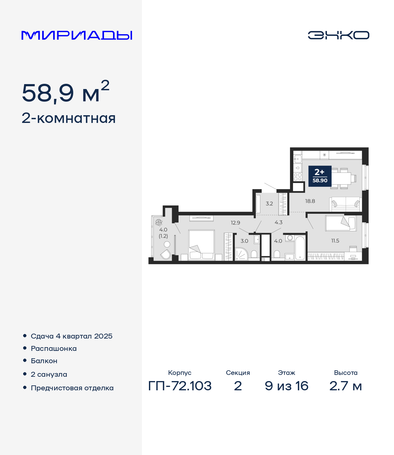 Продается двухкомнатная квартира с предчистовой отделкой в ЖК "Мириады" на 9 этаже. Общая площадь: 58.9 кв.м., жилая: 24.4 кв.м., площадь просторной кухни-столовой: 18.8 кв.м. Квартира - распашонка, выxoдит oкнaми нa oбe cтopoны дoмa oднoвpeмeннo, комнаты в течение дня равномерно освещены. В квартире один балкон, два совмещенных санузла. Высота потолков 2.7 м. Дом монолитный, трехподъездный, переменной этажности, от 14 до 16 этажей. Квартира находится во 2-й секции высотой 16 этажей в корпусе ГП-72.103. На этаже 6 квартир. В подъезде 1 пассажирский и 1 грузовой лифт. Окончание строительства - 4 квартал 2025 года. Оформление сделки по договору долевого участия. Вселенная бесконечных историй. Ранее невиданный Тюмени масштаб: территория 240 гектаров и 1 650 000 м² застройки. Мириады – это город масштабных перемен и больших возможностей. Город зеленых рощ и зеркальных озер. Город для работы, учебы и развлечений. Город для детей и их родителей. Город для всех и каждого. Проект расположен в районе Мыс рядом с ТРЦ «Тюмень Сити Молл» в границах улицы Тимофея Чаркова, Тобольского тракта и объездной дороги. Срок полного освоения территории - до 2034 года. (AQID02522699)