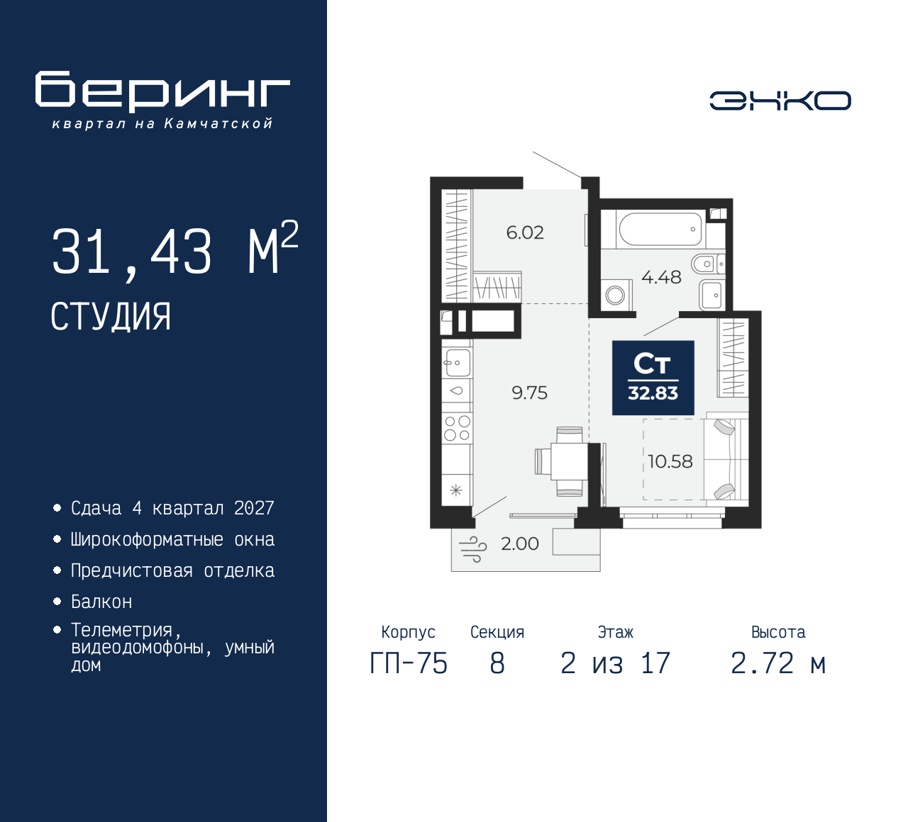 Продается однокомнатная квартира-студия с предчистовой отделкой в ЖК "Беринг" на 2 этаже. Общая площадь: 31.43 кв.м., площадь гостиной 20.33 кв.м., из которых 9.75 кв.м. выделено под кухонную зону. Все окна выходят на одну сторону. В квартире один балкон, один совмещенный санузел. Высота потолков 2.72 м. Дом монолитный, многоподъездный, переменной этажности, от 17 до 24 этажей. Квартира находится в 8-й секции высотой 17 этажей в корпусе ГП-75. На этаже 8 квартир. В подъезде 2 пассажирских и 1 грузовой лифт. Окончание строительства - 4 квартал 2027 года. Оформление сделки по договору долевого участия. Подобно знаменитому исследователю, мы чувствуем себя первооткрывателями этой локации. Хотим показать новую суть места, сформировать для вас жизненный опыт, которого ещё не было. Беринг — район зелёного цвета. Беринг — район, который откроется вам с другой стороны. Впечатлит новым уровнем комфорта и качеством жизни. Беринг — открытие на карте города. Первый квартал расположен в районе Тура, в границах улиц: Камчатская – Западносибирская – Энтузиастов. Вокруг уже есть всё для того, чтобы ежедневная рутина была лишь частью жизни и не доставляла дискомфорта. Школы и детские сады, магазины и аптеки, поликлиника, места для семейного отдыха, пеших и велопрогулок, и даже рыбалки. Масштабное озеленение дворов — визитная карточка ЭНКО и ваш оазис спокойствия, чтобы отвлечься от повседневности. Раскидистые деревья, кустарники, травы и цветы — осталось остановиться, вдохнуть и расслабиться, глядя на эту природную красоту. Стилистика подъездов продолжает концепцию Беринга, вдохновлённого Камчаткой: сдержанный, но при этом впечатляющий дизайн соседствует с удобством и функциональностью. (AQID02529538)