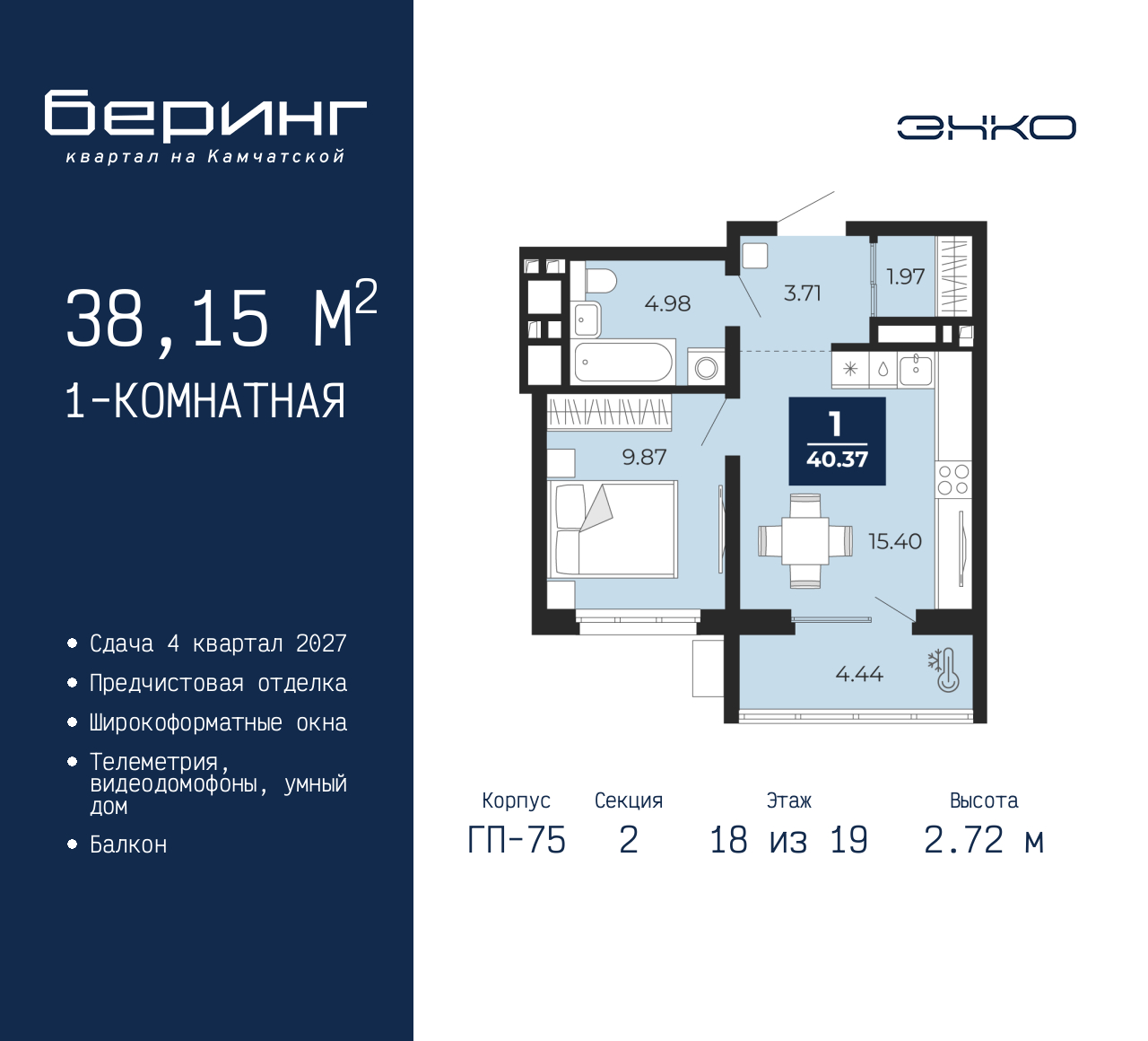 Просторная однокомнатная квартира с предчистовой отделкой в ЖК "Беринг" на 18 этаже. Общая площадь: 38.15 кв.м., жилая: 9.87 кв.м., площадь просторной кухни-столовой: 15.36 кв.м. Все окна выходят на одну сторону. В квартире один балкон, один совмещенный санузел. Высота потолков 2.72 м. Дом монолитный, многоподъездный, переменной этажности, от 17 до 24 этажей. Квартира находится во 2-й секции высотой 19 этажей в корпусе ГП-75. На этаже 7 квартир. В подъезде 2 пассажирских и 1 грузовой лифт. Окончание строительства - 4 квартал 2027 года. Оформление сделки по договору долевого участия. Подобно знаменитому исследователю, мы чувствуем себя первооткрывателями этой локации. Хотим показать новую суть места, сформировать для вас жизненный опыт, которого ещё не было. Беринг — район зелёного цвета. Беринг — район, который откроется вам с другой стороны. Впечатлит новым уровнем комфорта и качеством жизни. Беринг — открытие на карте города. Первый квартал расположен в районе Тура, в границах улиц: Камчатская – Западносибирская – Энтузиастов. Вокруг уже есть всё для того, чтобы ежедневная рутина была лишь частью жизни и не доставляла дискомфорта. Школы и детские сады, магазины и аптеки, поликлиника, места для семейного отдыха, пеших и велопрогулок, и даже рыбалки. Масштабное озеленение дворов — визитная карточка ЭНКО и ваш оазис спокойствия, чтобы отвлечься от повседневности. Раскидистые деревья, кустарники, травы и цветы — осталось остановиться, вдохнуть и расслабиться, глядя на эту природную красоту. Стилистика подъездов продолжает концепцию Беринга, вдохновлённого Камчаткой: сдержанный, но при этом впечатляющий дизайн соседствует с удобством и функциональностью. (AQID02529573)