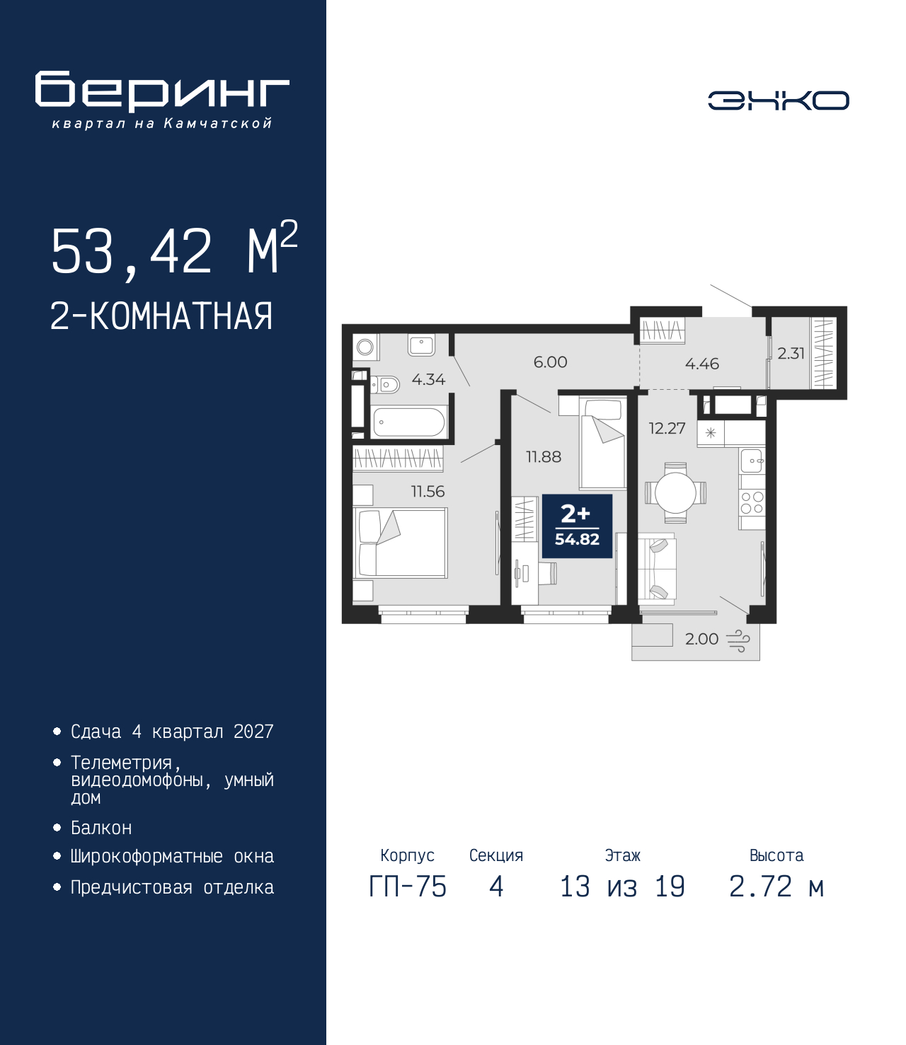 Просторная 2-комн. квартира с предчистовой отделкой в ЖК "Беринг" на 13 этаже. Общая площадь: 53.42 кв.м., жилая: 23.44 кв.м., площадь просторной кухни-столовой: 12.27 кв.м. Комнаты изолированные, все окна выходят на одну сторону. В квартире один балкон, один совмещенный санузел. Высота потолков 2.72 м. Дом монолитный, многоподъездный, переменной этажности, от 17 до 24 этажей. Квартира находится в 4-й секции высотой 19 этажей в корпусе ГП-75. На этаже 4 квартиры. В подъезде 2 пассажирских и 1 грузовой лифт. Окончание строительства - 4 квартал 2027 года. Оформление сделки по договору долевого участия. Подобно знаменитому исследователю, мы чувствуем себя первооткрывателями этой локации. Хотим показать новую суть места, сформировать для вас жизненный опыт, которого ещё не было. Беринг — район зелёного цвета. Беринг — район, который откроется вам с другой стороны. Впечатлит новым уровнем комфорта и качеством жизни. Беринг — открытие на карте города. Первый квартал расположен в районе Тура, в границах улиц: Камчатская – Западносибирская – Энтузиастов. Вокруг уже есть всё для того, чтобы ежедневная рутина была лишь частью жизни и не доставляла дискомфорта. Школы и детские сады, магазины и аптеки, поликлиника, места для семейного отдыха, пеших и велопрогулок, и даже рыбалки. Масштабное озеленение дворов — визитная карточка ЭНКО и ваш оазис спокойствия, чтобы отвлечься от повседневности. Раскидистые деревья, кустарники, травы и цветы — осталось остановиться, вдохнуть и расслабиться, глядя на эту природную красоту. Стилистика подъездов продолжает концепцию Беринга, вдохновлённого Камчаткой: сдержанный, но при этом впечатляющий дизайн соседствует с удобством и функциональностью. (AQID02529671)