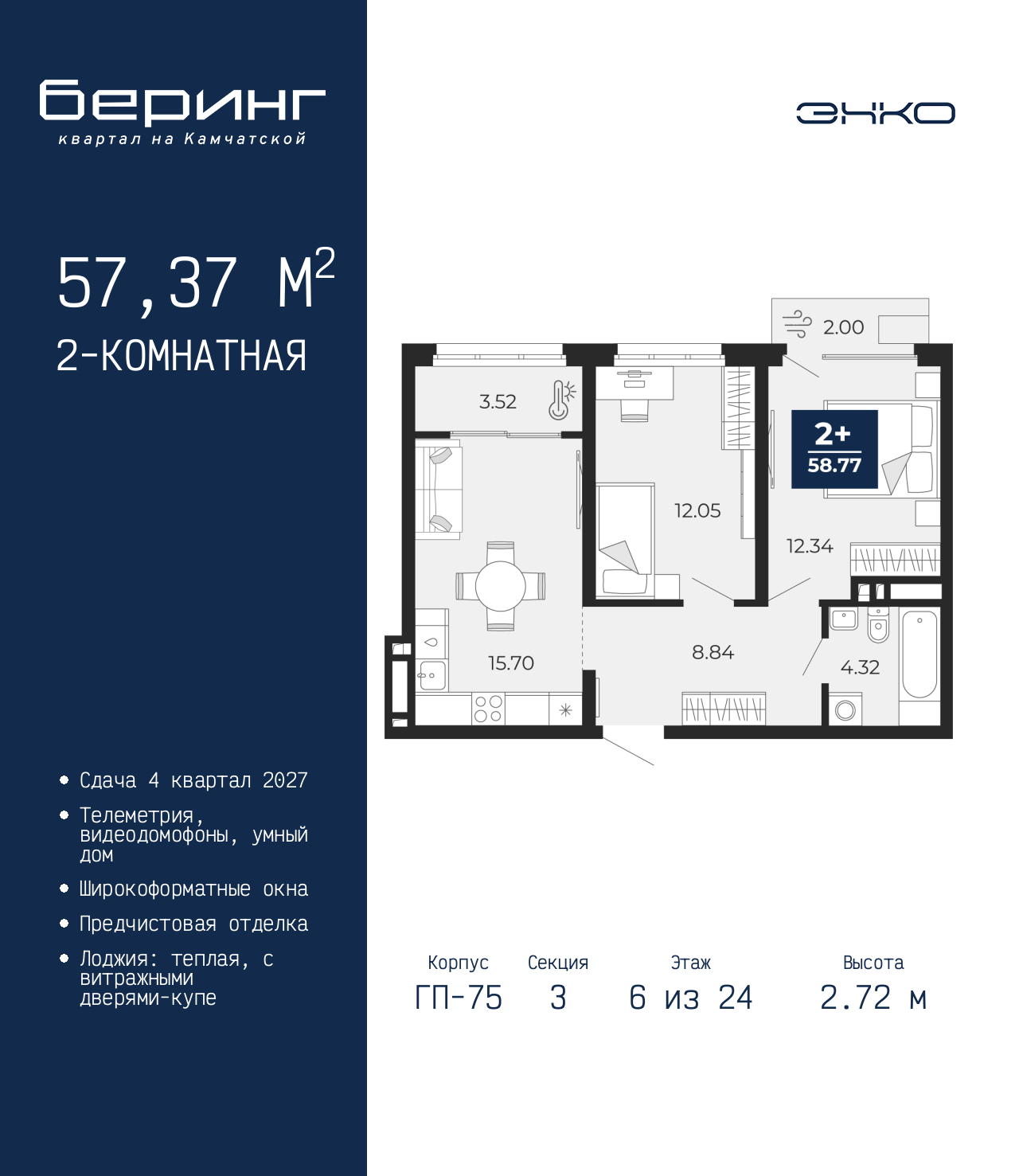 2-комн. квартира с предчистовой отделкой в ЖК "Беринг" на 6 этаже. Общая площадь: 57.37 кв.м., жилая: 24.39 кв.м., площадь просторной кухни-столовой: 15.7 кв.м. Комнаты изолированные, все окна выходят на одну сторону. В квартире один балкон и одна лоджия, один совмещенный санузел. Высота потолков 2.72 м. Дом монолитный, многоподъездный, переменной этажности, от 17 до 24 этажей. Квартира находится в 3-й секции высотой 24 этажа в корпусе ГП-75. На этаже 6 квартир. В подъезде 2 пассажирских и 1 грузовой лифт. Окончание строительства - 4 квартал 2027 года. Оформление сделки по договору долевого участия. Подобно знаменитому исследователю, мы чувствуем себя первооткрывателями этой локации. Хотим показать новую суть места, сформировать для вас жизненный опыт, которого ещё не было. Беринг — район зелёного цвета. Беринг — район, который откроется вам с другой стороны. Впечатлит новым уровнем комфорта и качеством жизни. Беринг — открытие на карте города. Первый квартал расположен в районе Тура, в границах улиц: Камчатская – Западносибирская – Энтузиастов. Вокруг уже есть всё для того, чтобы ежедневная рутина была лишь частью жизни и не доставляла дискомфорта. Школы и детские сады, магазины и аптеки, поликлиника, места для семейного отдыха, пеших и велопрогулок, и даже рыбалки. Масштабное озеленение дворов — визитная карточка ЭНКО и ваш оазис спокойствия, чтобы отвлечься от повседневности. Раскидистые деревья, кустарники, травы и цветы — осталось остановиться, вдохнуть и расслабиться, глядя на эту природную красоту. Стилистика подъездов продолжает концепцию Беринга, вдохновлённого Камчаткой: сдержанный, но при этом впечатляющий дизайн соседствует с удобством и функциональностью. (AQID02529692)
