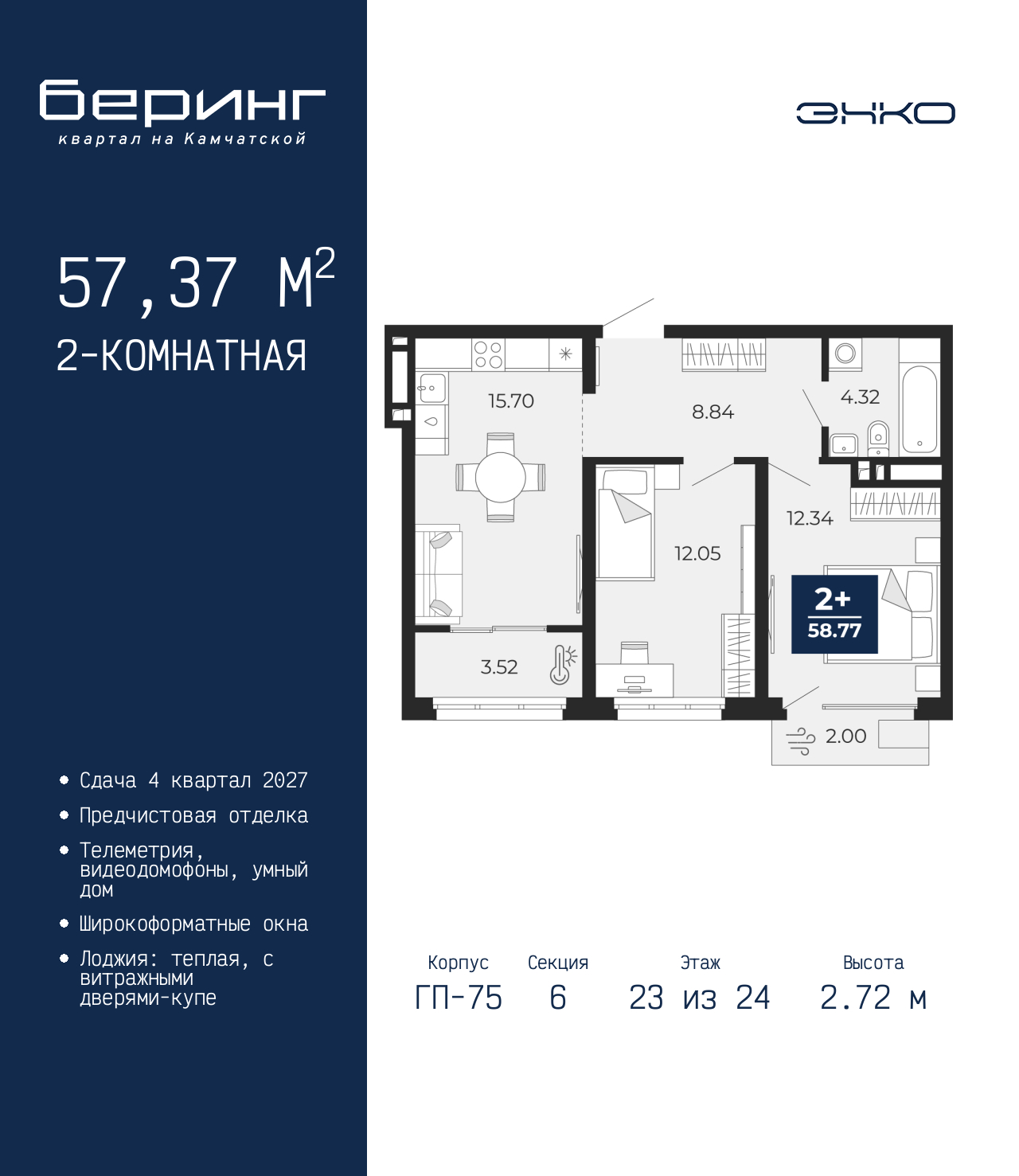 Продается 2-комн. квартира от застройщика с предчистовой отделкой в ЖК "Беринг" на 23 этаже. Общая площадь: 57.37 кв.м., жилая: 24.39 кв.м., площадь просторной кухни-столовой: 15.7 кв.м. Комнаты изолированные, все окна выходят на одну сторону. В квартире один балкон и одна лоджия, один совмещенный санузел. Высота потолков 2.72 м. Дом монолитный, многоподъездный, переменной этажности, от 17 до 24 этажей. Квартира находится в 6-й секции высотой 24 этажа в корпусе ГП-75. На этаже 6 квартир. В подъезде 2 пассажирских и 1 грузовой лифт. Окончание строительства - 4 квартал 2027 года. Оформление сделки по договору долевого участия. Подобно знаменитому исследователю, мы чувствуем себя первооткрывателями этой локации. Хотим показать новую суть места, сформировать для вас жизненный опыт, которого ещё не было. Беринг — район зелёного цвета. Беринг — район, который откроется вам с другой стороны. Впечатлит новым уровнем комфорта и качеством жизни. Беринг — открытие на карте города. Первый квартал расположен в районе Тура, в границах улиц: Камчатская – Западносибирская – Энтузиастов. Вокруг уже есть всё для того, чтобы ежедневная рутина была лишь частью жизни и не доставляла дискомфорта. Школы и детские сады, магазины и аптеки, поликлиника, места для семейного отдыха, пеших и велопрогулок, и даже рыбалки. Масштабное озеленение дворов — визитная карточка ЭНКО и ваш оазис спокойствия, чтобы отвлечься от повседневности. Раскидистые деревья, кустарники, травы и цветы — осталось остановиться, вдохнуть и расслабиться, глядя на эту природную красоту. Стилистика подъездов продолжает концепцию Беринга, вдохновлённого Камчаткой: сдержанный, но при этом впечатляющий дизайн соседствует с удобством и функциональностью. (AQID02529720)
