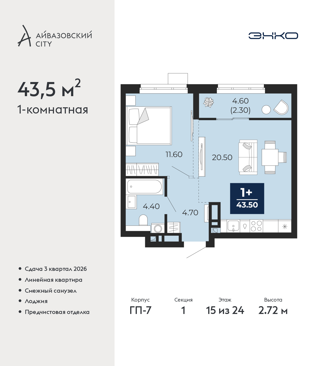 Просторная 1-комн. квартира с предчистовой отделкой в ЖК "Айвазовский City" на 15 этаже. Общая площадь: 43.5 кв.м., жилая: 11.6 кв.м., площадь просторной кухни-столовой: 20.5 кв.м. Все окна выходят на одну сторону. В квартире одна лоджия, один совмещенный санузел. Высота потолков 2.72 м. Дом монолитный, многоподъездный, переменной этажности, от 9 до 24 этажей. Квартира находится в 1-й секции высотой 24 этажа в корпусе ГП-7. На этаже 6 квартир. В подъезде 1 пассажирский и 2 грузовых лифта. Окончание строительства - 3 квартал 2026 года. Оформление сделки по договору долевого участия. Новый жилой район располагается в живописном месте на берегу Туры в центральной части города. Принципиально новое пространство для жизни в центре современного города для тех, чьи мечты сбываются, кто нацелен на постоянный рост, перемены к лучшему для себя и своих близких. Каждая деталь Айвазовский City вдохновляет и заряжает на новые свершения: авторская архитектура, сбалансированная продуманная инфраструктура, дизайнерские дворы со спортивными и детскими площадками, парковые зоны с фонтанами, водный канал, украшающий центральный прогулочный маршрут района и многое другое. В 2019 года проект стал лауреатом престижной премии Urban Awards 2019 в номинации «Лучший строящийся региональный жилой комплекс бизнес-класса». Главная особенность Айвазовский City - соседство разных архитектурных школ в рамках одного дома. Изысканная классика, выразительная эклектика и оригинальный модерн - жить в одном из таких домов настоящий повод для гордости. Айвазовский City это идеальное сочетание комфорта, технологий и развитой инфраструктуры. Вход в подъезд возможен с улицы и со двора. Отправляясь на работу или за покупками, жители могут выйти с внешней стороны дома, а для прогулки с ребенком – со стороны двора. Экологически чистые материалы и энергосберегающие технологии, качественное освещение общественных зон, видеонаблюдение по всей территории жилого района (в том числе в подъездах, лифтах и в подземном паркинге), закрытые дворы с доступом только для жителей Айвазовский City. Часть домов в Айвазовский City будут оснащены подземным паркингом. Востребованный в нашем климатическом поясе формат хранения автомобилей защитит собственность владельца в любое время года. Аккредитация в банках: ПАО Банк «ВТБ», «Сбербанк России», ОАО «Альфа-Банк», ПАО «Газпромбанк», ПАО «Совкомбанк» и других. (AQID02483563)