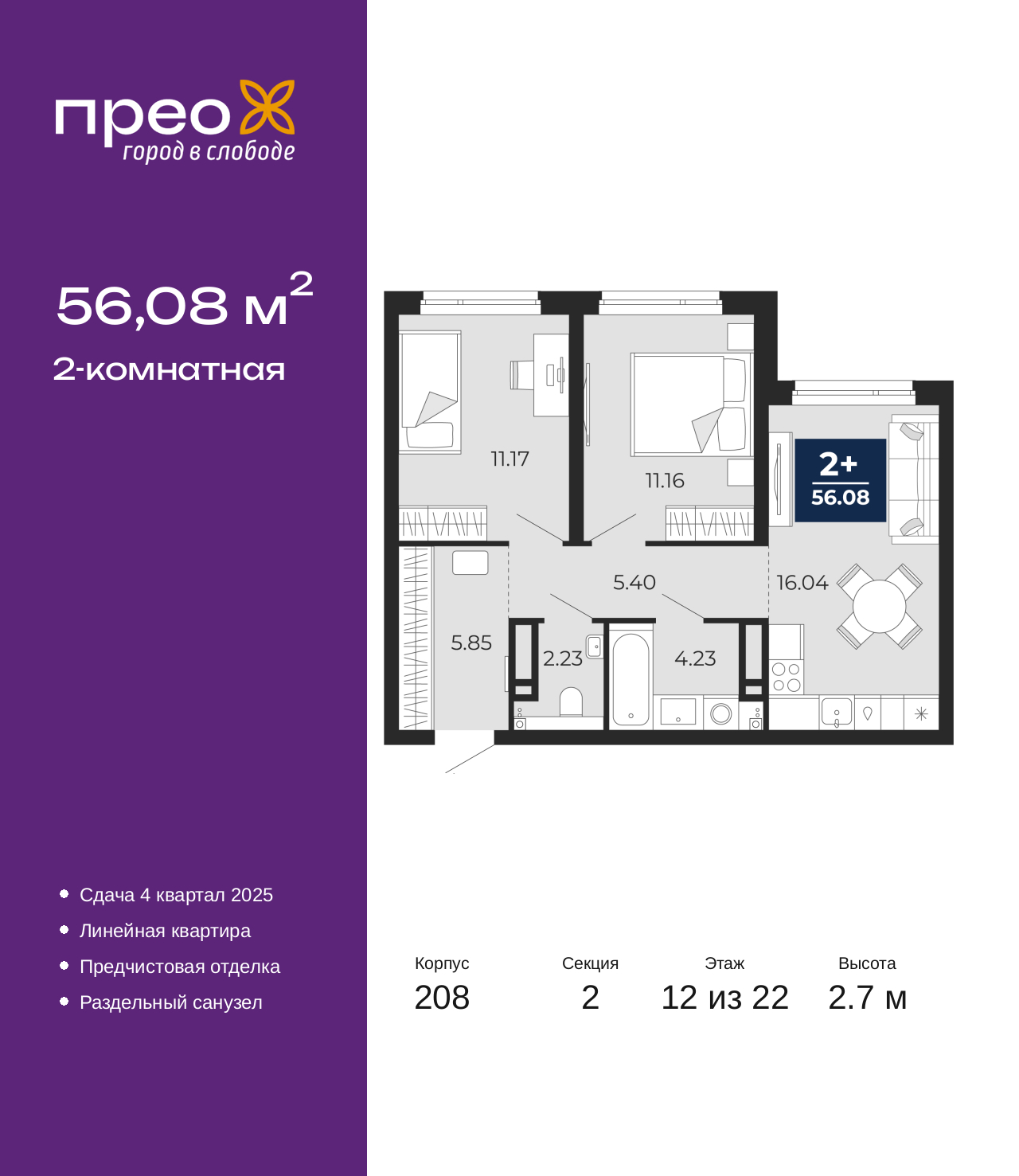 2-комн. квартира от застройщика с предчистовой отделкой в ЖК "Прео" на 12 этаже. Общая площадь: 56.08 кв.м., жилая: 22.33 кв.м., площадь просторной кухни-столовой: 16.04 кв.м. Комнаты изолированные, все окна выходят на одну сторону. В квартире один раздельный санузел. Высота потолков 2.7 м. Дом монолитный, трехподъездный, переменной этажности, от 14 до 22 этажей. Квартира находится во 2-й секции высотой 22 этажа в корпусе 208. На этаже 10 квартир. В подъезде 1 пассажирский и 1 грузовой лифт. Окончание строительства - 4 квартал 2025 года. Оформление сделки по договору долевого участия. Преображенский — один из самых привлекательных районов для жизни! Это полностью самостоятельный жилой район с точки зрения инфраструктуры. Преображенский находится между Московским и Червишевским трактами в квартале улиц Закалужская — Вьюжная — Александра Протозанова. Не нужно ждать, когда появится инфраструктура — переезжайте на всё готовое. Вблизи расположены действующие школа и детский сад. В этом году откроется еще один сад, а в следующем году — школа. По соседству с Преображенским запланировано строительство городского парка «Комарово» площадью 38 гектар. За 10 минут можно доехать на автомобиле до крупных ТРЦ: «Лента», «Кристалл», «Леруа Мерлен», «Метро» и «Ашан». С 2018 года в районе открыт Соседский центр — пространство, созданное для формирования добрососедской среды, совместного досуга, общения и реализации соседских инициатив. Здесь проходят встречи соседей, а также сами жители района организовывают мероприятия. Организатором такого события может стать любой желающий. В квартирах выполнена качественная предчистовая отделка. Гладкие стены с финишным выравниванием по маякам. Ровный потолок для установки натяжного потолка. Установлены пятикамерные окна с двойным стеклопакетом (3 стекла). Дизайнерские холлы с видеонаблюдением, безбарьерным и прозрачным входом – всегда светло и спокойно. На первом этаже есть просторные колясочные, где все жители могут оставлять свои коляски и велосипеды. В Преображенском есть всё, что нужно для активного отдыха и занятий спортом. Мы сделали большое футбольное поле с безопасным покрытием. Также установили хоккейный корт, который оборудован по всем необходимым стандартам. Во дворах можно делать упражнения на специальных площадках с турниками. Весь район мы обустроили велодорожками, которые связаны в единый маршрут. У нас есть сухие фонтаны, бьющие из земли, деревья, веревки, сетки, скалодром, газон, песок и резинка — осталось просто дать своему ребенку право на свободную игру. По-настоящему хорошие дворы — это те, которые дети предпочитают соцсетям и телевизору. Аккредитация в банках: ПАО «Банк Уралсиб», «Сбербанк России», ПАО «Газпромбанк», ПАО Банк «ВТБ», ОАО «Альфа-Банк» и других. (AQID02502729)