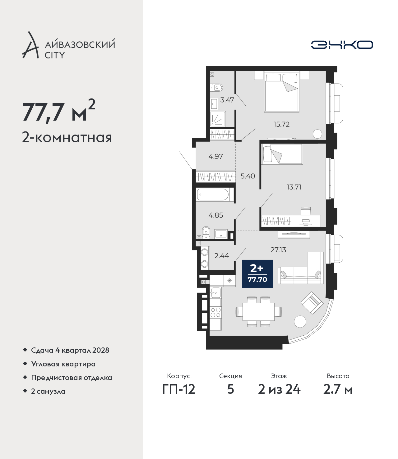 Двухкомнатная квартира от застройщика с предчистовой отделкой в ЖК "Айвазовский City" на 2 этаже. Общая площадь: 77.7 кв.м., жилая: 29.43 кв.м., площадь просторной кухни-столовой: 27.13 кв.м. Квартира угловая, очень светлая, естественная вентиляция при открытии окон. В квартире два совмещенных санузла. Высота потолков 2.7 м. Дом монолитный, многоподъездный, высотой 24 этажа. Квартира находится в 5-й секции в корпусе ГП-12. На этаже 5 квартир. В подъезде 1 пассажирский и 1 грузовой лифт. Окончание строительства - 4 квартал 2028 года. Оформление сделки по договору долевого участия. Новый жилой район располагается в живописном месте на берегу Туры в центральной части города. Принципиально новое пространство для жизни в центре современного города для тех, чьи мечты сбываются, кто нацелен на постоянный рост, перемены к лучшему для себя и своих близких. Каждая деталь Айвазовский City вдохновляет и заряжает на новые свершения: авторская архитектура, сбалансированная продуманная инфраструктура, дизайнерские дворы со спортивными и детскими площадками, парковые зоны с фонтанами, водный канал, украшающий центральный прогулочный маршрут района и многое другое. В 2019 года проект стал лауреатом престижной премии Urban Awards 2019 в номинации «Лучший строящийся региональный жилой комплекс бизнес-класса». Главная особенность Айвазовский City - соседство разных архитектурных школ в рамках одного дома. Изысканная классика, выразительная эклектика и оригинальный модерн - жить в одном из таких домов настоящий повод для гордости. Айвазовский City это идеальное сочетание комфорта, технологий и развитой инфраструктуры. Вход в подъезд возможен с улицы и со двора. Отправляясь на работу или за покупками, жители могут выйти с внешней стороны дома, а для прогулки с ребенком – со стороны двора. Экологически чистые материалы и энергосберегающие технологии, качественное освещение общественных зон, видеонаблюдение по всей территории жилого района (в том числе в подъездах, лифтах и в подземном паркинге), закрытые дворы с доступом только для жителей Айвазовский City. Часть домов в Айвазовский City будут оснащены подземным паркингом. Востребованный в нашем климатическом поясе формат хранения автомобилей защитит собственность владельца в любое время года. Аккредитация в банках: «Сбербанк России», ОАО «Альфа-Банк», ПАО Банк «ВТБ», ПАО «Газпромбанк», АО "ДОМ.РФ" и других. (AQID02525738)