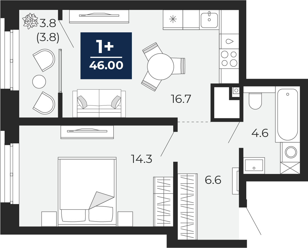 Просторная 1-комн. квартира с предчистовой отделкой в ЖК "Мириады" на 10 этаже. Общая площадь: 46 кв.м., жилая: 14.3 кв.м., площадь просторной кухни-столовой: 16.7 кв.м. Все окна выходят на одну сторону. В квартире одна лоджия, один совмещенный санузел. Высота потолков 2.7 м. Дом монолитный, трехподъездный, переменной этажности, от 14 до 16 этажей. Квартира находится в 1-й секции высотой 16 этажей в корпусе ГП-72.103. На этаже 8 квартир. В подъезде 1 пассажирский и 1 грузовой лифт. Окончание строительства - 4 квартал 2025 года. Оформление сделки по договору долевого участия. Вселенная бесконечных историй. Ранее невиданный Тюмени масштаб: территория 240 гектаров и 1 650 000 м² застройки. Мириады – это город масштабных перемен и больших возможностей. Город зеленых рощ и зеркальных озер. Город для работы, учебы и развлечений. Город для детей и их родителей. Город для всех и каждого. Проект расположен в районе Мыс рядом с ТРЦ «Тюмень Сити Молл» в границах улицы Тимофея Чаркова, Тобольского тракта и объездной дороги. Срок полного освоения территории - до 2034 года. (AQID02536493)