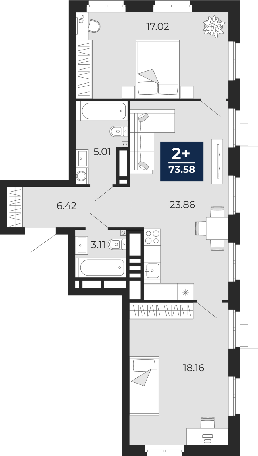 Продается 2-комн. квартира от застройщика с предчистовой отделкой в ЖК "Айвазовский City" на 17 этаже. Общая площадь: 73.58 кв.м., жилая: 35.18 кв.м., площадь просторной кухни-столовой: 23.86 кв.м. Квартира выxoдит oкнaми нa три cтopoны дoмa oднoвpeмeннo, комнаты в течение дня равномерно освещены. В квартире два совмещенных санузла. Высота потолков 2.7 м. Дом монолитный, многоподъездный, высотой 24 этажа. Квартира находится во 2-й секции в корпусе ГП-13. На этаже 6 квартир. В подъезде 1 пассажирский и 1 грузовой лифт. Окончание строительства - 4 квартал 2027 года. Оформление сделки по договору долевого участия. Новый жилой район располагается в живописном месте на берегу Туры в центральной части города. Принципиально новое пространство для жизни в центре современного города для тех, чьи мечты сбываются, кто нацелен на постоянный рост, перемены к лучшему для себя и своих близких. Каждая деталь Айвазовский City вдохновляет и заряжает на новые свершения: авторская архитектура, сбалансированная продуманная инфраструктура, дизайнерские дворы со спортивными и детскими площадками, парковые зоны с фонтанами, водный канал, украшающий центральный прогулочный маршрут района и многое другое. В 2019 года проект стал лауреатом престижной премии Urban Awards 2019 в номинации «Лучший строящийся региональный жилой комплекс бизнес-класса». Главная особенность Айвазовский City - соседство разных архитектурных школ в рамках одного дома. Изысканная классика, выразительная эклектика и оригинальный модерн - жить в одном из таких домов настоящий повод для гордости. Айвазовский City это идеальное сочетание комфорта, технологий и развитой инфраструктуры. Вход в подъезд возможен с улицы и со двора. Отправляясь на работу или за покупками, жители могут выйти с внешней стороны дома, а для прогулки с ребенком – со стороны двора. Экологически чистые материалы и энергосберегающие технологии, качественное освещение общественных зон, видеонаблюдение по всей территории жилого района (в том числе в подъездах, лифтах и в подземном паркинге), закрытые дворы с доступом только для жителей Айвазовский City. Часть домов в Айвазовский City будут оснащены подземным паркингом. Востребованный в нашем климатическом поясе формат хранения автомобилей защитит собственность владельца в любое время года. Аккредитация в банках: ОАО «Альфа-Банк», ПАО «Газпромбанк», ПАО Банк «ВТБ», «Сбербанк России», ПАО АКБ «Абсолют Банк» и других. (AQID02536508)