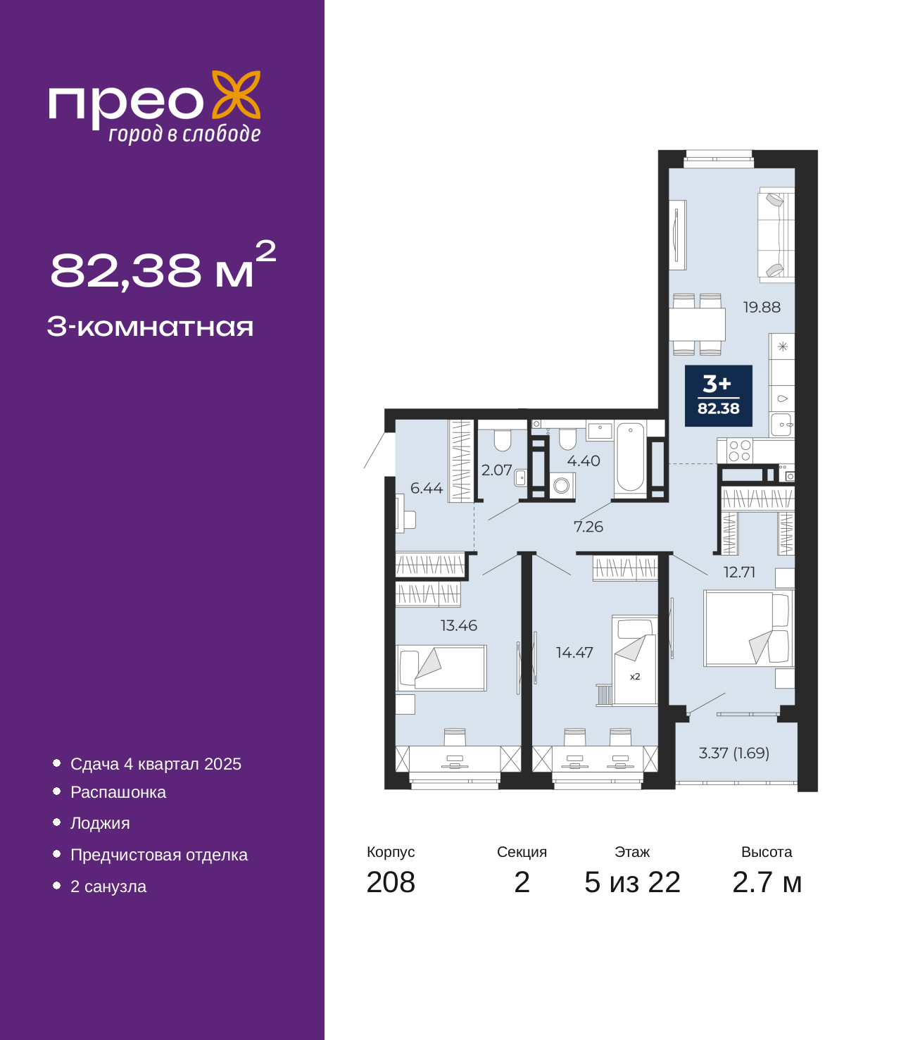 Продается трехкомнатная квартира с предчистовой отделкой в ЖК "Прео" на 5 этаже. Общая площадь: 82.38 кв.м., жилая: 40.64 кв.м., площадь просторной кухни-столовой: 19.88 кв.м. Квартира - распашонка, без проходных комнат, окна выходят на paзные стороны дома. В квартире одна лоджия, один совмещенный и один раздельный санузел. Высота потолков 2.7 м. Дом монолитный, трехподъездный, переменной этажности, от 14 до 22 этажей. Квартира находится во 2-й секции высотой 22 этажа в корпусе 208. На этаже 10 квартир. В подъезде 1 пассажирский и 1 грузовой лифт. Окончание строительства - 4 квартал 2025 года. Оформление сделки по договору долевого участия. Преображенский — один из самых привлекательных районов для жизни! Это полностью самостоятельный жилой район с точки зрения инфраструктуры. Преображенский находится между Московским и Червишевским трактами в квартале улиц Закалужская — Вьюжная — Александра Протозанова. Не нужно ждать, когда появится инфраструктура — переезжайте на всё готовое. Вблизи расположены действующие школа и детский сад. В этом году откроется еще один сад, а в следующем году — школа. По соседству с Преображенским запланировано строительство городского парка «Комарово» площадью 38 гектар. За 10 минут можно доехать на автомобиле до крупных ТРЦ: «Лента», «Кристалл», «Леруа Мерлен», «Метро» и «Ашан». С 2018 года в районе открыт Соседский центр — пространство, созданное для формирования добрососедской среды, совместного досуга, общения и реализации соседских инициатив. Здесь проходят встречи соседей, а также сами жители района организовывают мероприятия. Организатором такого события может стать любой желающий. В квартирах выполнена качественная предчистовая отделка. Гладкие стены с финишным выравниванием по маякам. Ровный потолок для установки натяжного потолка. Установлены пятикамерные окна с двойным стеклопакетом (3 стекла). Дизайнерские холлы с видеонаблюдением, безбарьерным и прозрачным входом – всегда светло и спокойно. На первом этаже есть просторные колясочные, где все жители могут оставлять свои коляски и велосипеды. В Преображенском есть всё, что нужно для активного отдыха и занятий спортом. Мы сделали большое футбольное поле с безопасным покрытием. Также установили хоккейный корт, который оборудован по всем необходимым стандартам. Во дворах можно делать упражнения на специальных площадках с турниками. Весь район мы обустроили велодорожками, которые связаны в единый маршрут. У нас есть сухие фонтаны, бьющие из земли, деревья, веревки, сетки, скалодром, газон, песок и резинка — осталось просто дать своему ребенку право на свободную игру. По-настоящему хорошие дворы — это те, которые дети предпочитают соцсетям и телевизору. Аккредитация в банках: ПАО «Банк Уралсиб», ОАО «Альфа-Банк», ПАО «Газпромбанк», ПАО Банк «ВТБ», «Сбербанк России» и других. (AQID02502702)