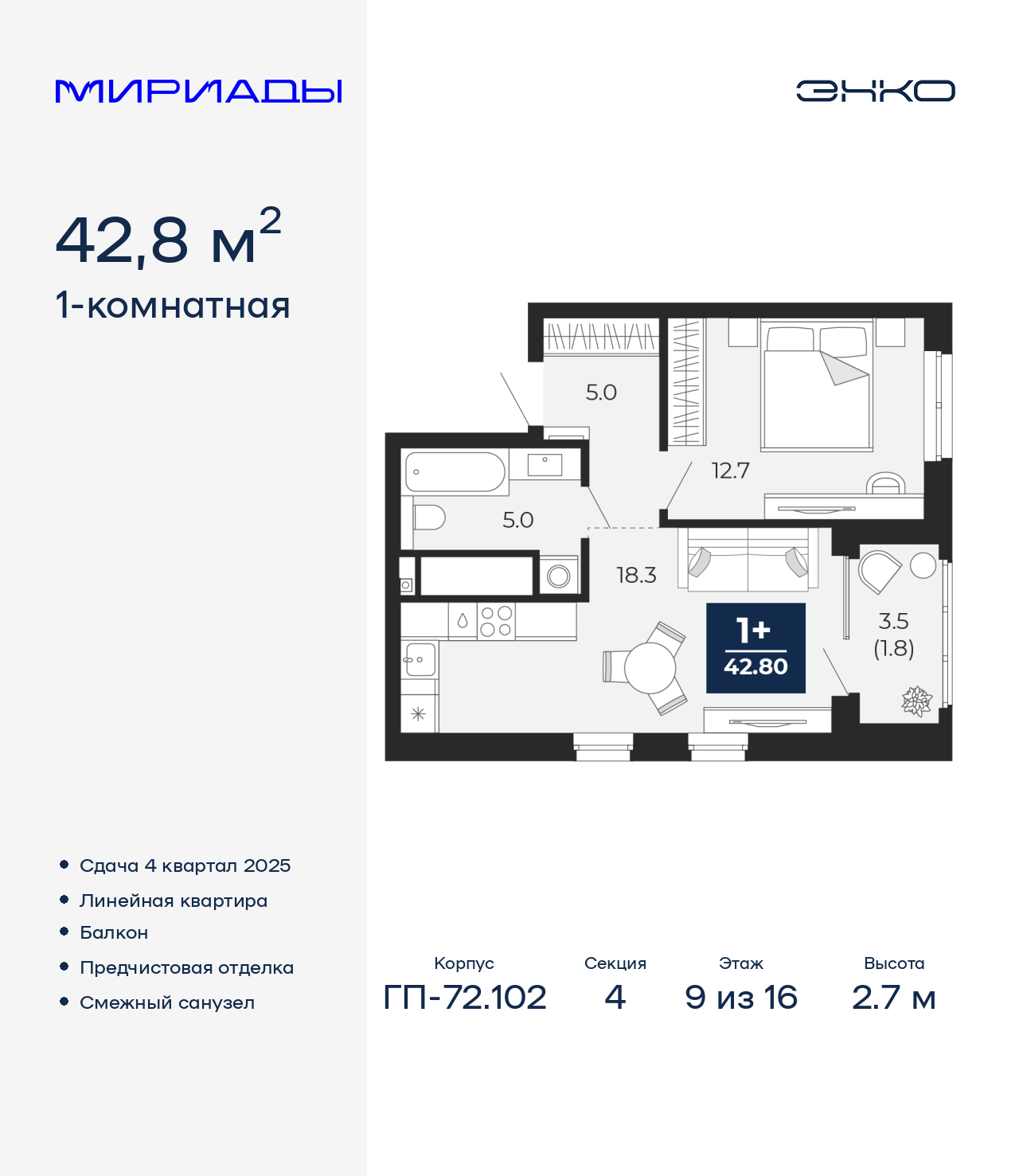 Продается однокомнатная квартира с предчистовой отделкой в ЖК "Мириады" на 9 этаже. Общая площадь: 42.8 кв.м., жилая: 12.9 кв.м., площадь просторной кухни-столовой: 16.1 кв.м. Все окна выходят на одну сторону. В квартире один балкон, один совмещенный санузел. Высота потолков 2.7 м. Дом монолитный, многоподъездный, переменной этажности, от 14 до 16 этажей. Квартира находится в 4-й секции высотой 16 этажей в корпусе ГП-72.102. На этаже 6 квартир. В подъезде 1 пассажирский и 1 грузовой лифт. Окончание строительства - 4 квартал 2025 года. Оформление сделки по договору долевого участия. Вселенная бесконечных историй. Ранее невиданный Тюмени масштаб: территория 240 гектаров и 1 650 000 м² застройки. Мириады – это город масштабных перемен и больших возможностей. Город зеленых рощ и зеркальных озер. Город для работы, учебы и развлечений. Город для детей и их родителей. Город для всех и каждого. Проект расположен в районе Мыс рядом с ТРЦ «Тюмень Сити Молл» в границах улицы Тимофея Чаркова, Тобольского тракта и объездной дороги. Срок полного освоения территории - до 2034 года. (AQID02522778)