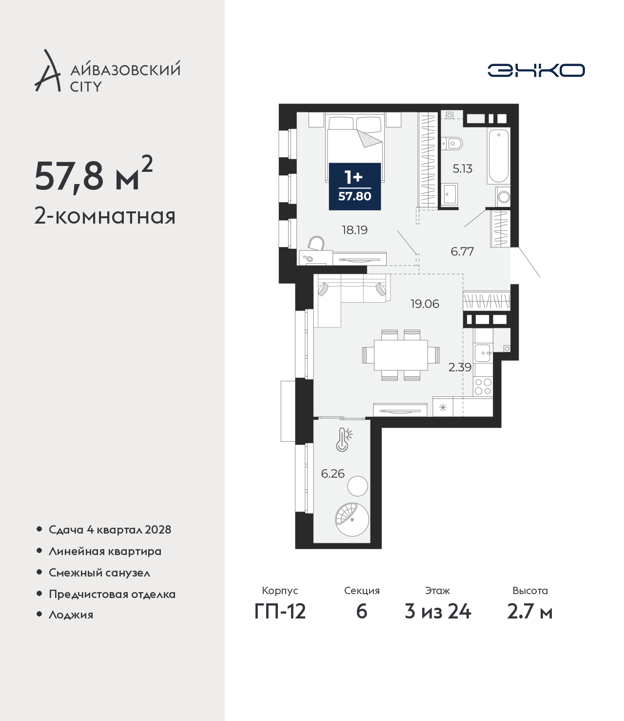- Общая площадь 57.8 м²