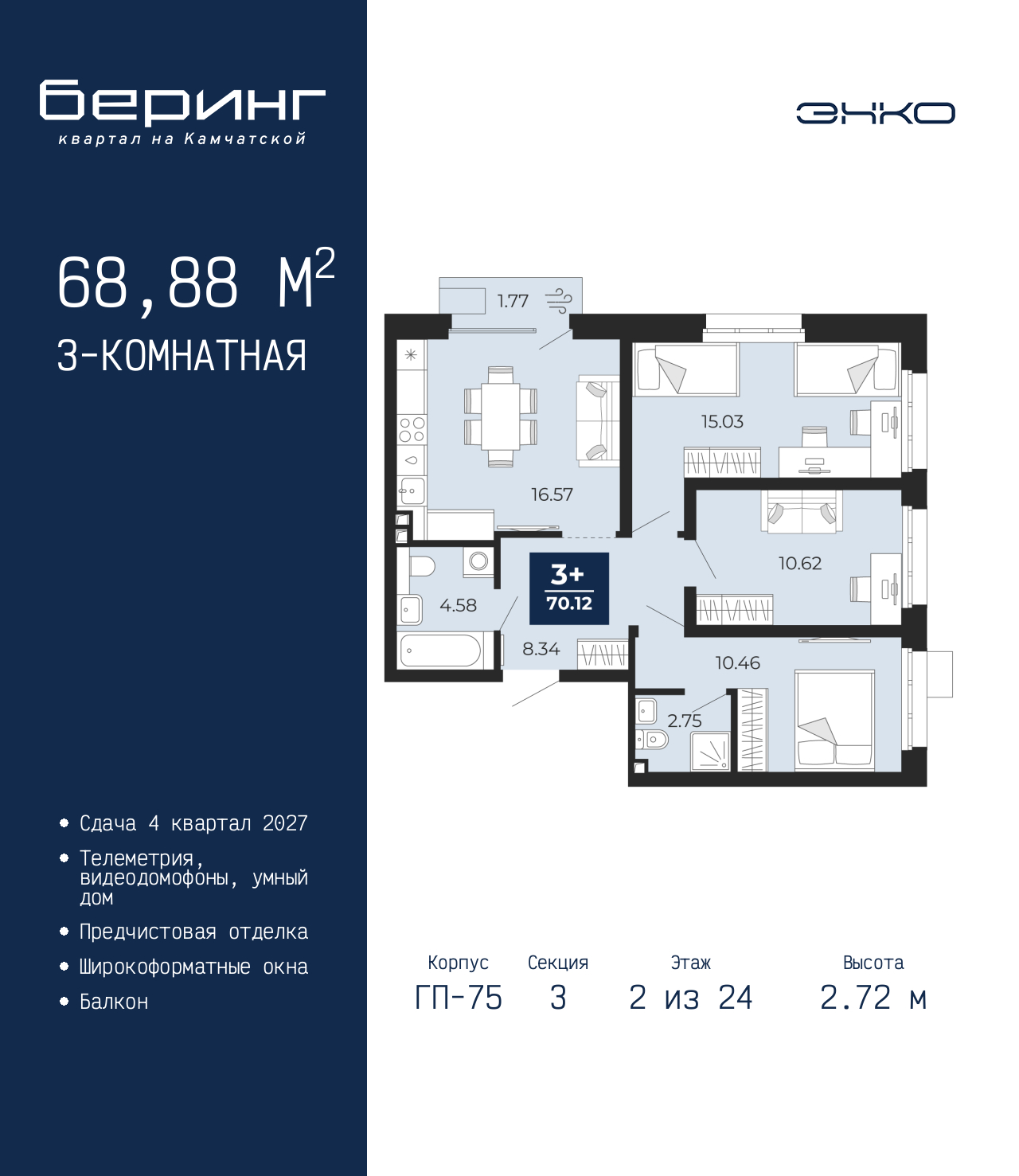 Просторная трехкомнатная квартира с предчистовой отделкой в ЖК "Беринг" на 2 этаже. Общая площадь: 68.88 кв.м., жилая: 36.11 кв.м., площадь просторной кухни-столовой: 16.57 кв.м. Квартира угловая, идеально подойдет любителям тишины и панорамных видов. В квартире один балкон, два совмещенных санузла. Высота потолков 2.72 м. Дом монолитный, многоподъездный, переменной этажности, от 17 до 24 этажей. Квартира находится в 3-й секции высотой 24 этажа в корпусе ГП-75. На этаже 6 квартир. В подъезде 2 пассажирских и 1 грузовой лифт. Окончание строительства - 4 квартал 2027 года. Оформление сделки по договору долевого участия. Подобно знаменитому исследователю, мы чувствуем себя первооткрывателями этой локации. Хотим показать новую суть места, сформировать для вас жизненный опыт, которого ещё не было. Беринг — район зелёного цвета. Беринг — район, который откроется вам с другой стороны. Впечатлит новым уровнем комфорта и качеством жизни. Беринг — открытие на карте города. Первый квартал расположен в районе Тура, в границах улиц: Камчатская – Западносибирская – Энтузиастов. Вокруг уже есть всё для того, чтобы ежедневная рутина была лишь частью жизни и не доставляла дискомфорта. Школы и детские сады, магазины и аптеки, поликлиника, места для семейного отдыха, пеших и велопрогулок, и даже рыбалки. Масштабное озеленение дворов — визитная карточка ЭНКО и ваш оазис спокойствия, чтобы отвлечься от повседневности. Раскидистые деревья, кустарники, травы и цветы — осталось остановиться, вдохнуть и расслабиться, глядя на эту природную красоту. Стилистика подъездов продолжает концепцию Беринга, вдохновлённого Камчаткой: сдержанный, но при этом впечатляющий дизайн соседствует с удобством и функциональностью. (AQID02529750)