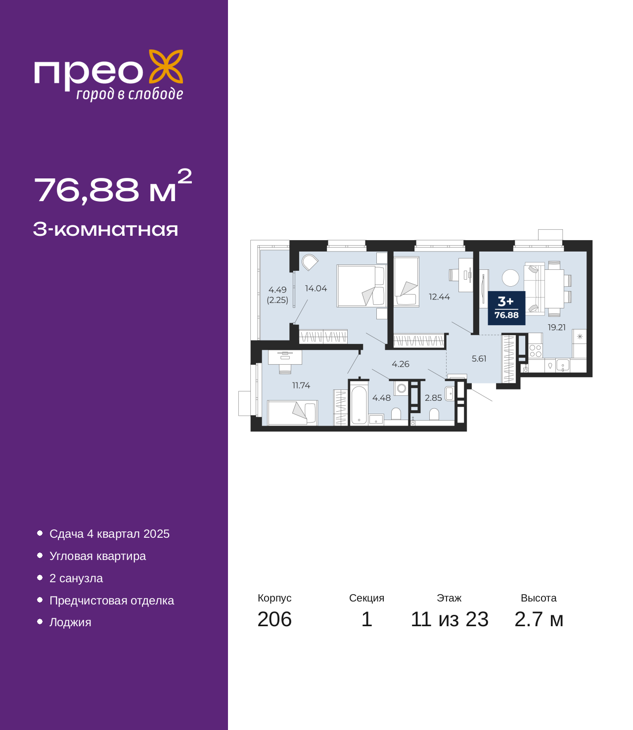 Трехкомнатная квартира от застройщика с предчистовой отделкой в ЖК "Прео" на 11 этаже. Общая площадь: 76.88 кв.м., жилая: 38.22 кв.м., площадь просторной кухни-столовой: 19.21 кв.м. Угловая квартира, идеально подойдет любителям тишины и панорамных видов. В квартире одна лоджия, один совмещенный и один раздельный санузел. Высота потолков 2.7 м. Дом монолитный, трехподъездный, переменной этажности, от 14 до 23 этажей. Квартира находится в 1-й секции высотой 23 этажа в корпусе 206. На этаже 8 квартир. В подъезде 1 пассажирский и 1 грузовой лифт. Окончание строительства - 4 квартал 2025 года. Оформление сделки по договору долевого участия. Преображенский — один из самых привлекательных районов для жизни! Это полностью самостоятельный жилой район с точки зрения инфраструктуры. Преображенский находится между Московским и Червишевским трактами в квартале улиц Закалужская — Вьюжная — Александра Протозанова. Не нужно ждать, когда появится инфраструктура — переезжайте на всё готовое. Вблизи расположены действующие школа и детский сад. В этом году откроется еще один сад, а в следующем году — школа. По соседству с Преображенским запланировано строительство городского парка «Комарово» площадью 38 гектар. За 10 минут можно доехать на автомобиле до крупных ТРЦ: «Лента», «Кристалл», «Леруа Мерлен», «Метро» и «Ашан». С 2018 года в районе открыт Соседский центр — пространство, созданное для формирования добрососедской среды, совместного досуга, общения и реализации соседских инициатив. Здесь проходят встречи соседей, а также сами жители района организовывают мероприятия. Организатором такого события может стать любой желающий. В квартирах выполнена качественная предчистовая отделка. Гладкие стены с финишным выравниванием по маякам. Ровный потолок для установки натяжного потолка. Установлены пятикамерные окна с двойным стеклопакетом (3 стекла). Дизайнерские холлы с видеонаблюдением, безбарьерным и прозрачным входом – всегда светло и спокойно. На первом этаже есть просторные колясочные, где все жители могут оставлять свои коляски и велосипеды. В Преображенском есть всё, что нужно для активного отдыха и занятий спортом. Мы сделали большое футбольное поле с безопасным покрытием. Также установили хоккейный корт, который оборудован по всем необходимым стандартам. Во дворах можно делать упражнения на специальных площадках с турниками. Весь район мы обустроили велодорожками, которые связаны в единый маршрут. У нас есть сухие фонтаны, бьющие из земли, деревья, веревки, сетки, скалодром, газон, песок и резинка — осталось просто дать своему ребенку право на свободную игру. По-настоящему хорошие дворы — это те, которые дети предпочитают соцсетям и телевизору. Аккредитация в банках: ПАО Банк «ВТБ», ПАО «Банк Уралсиб», «Сбербанк России», ПАО «Газпромбанк», ОАО «Альфа-Банк» и других. (AQID02532046)