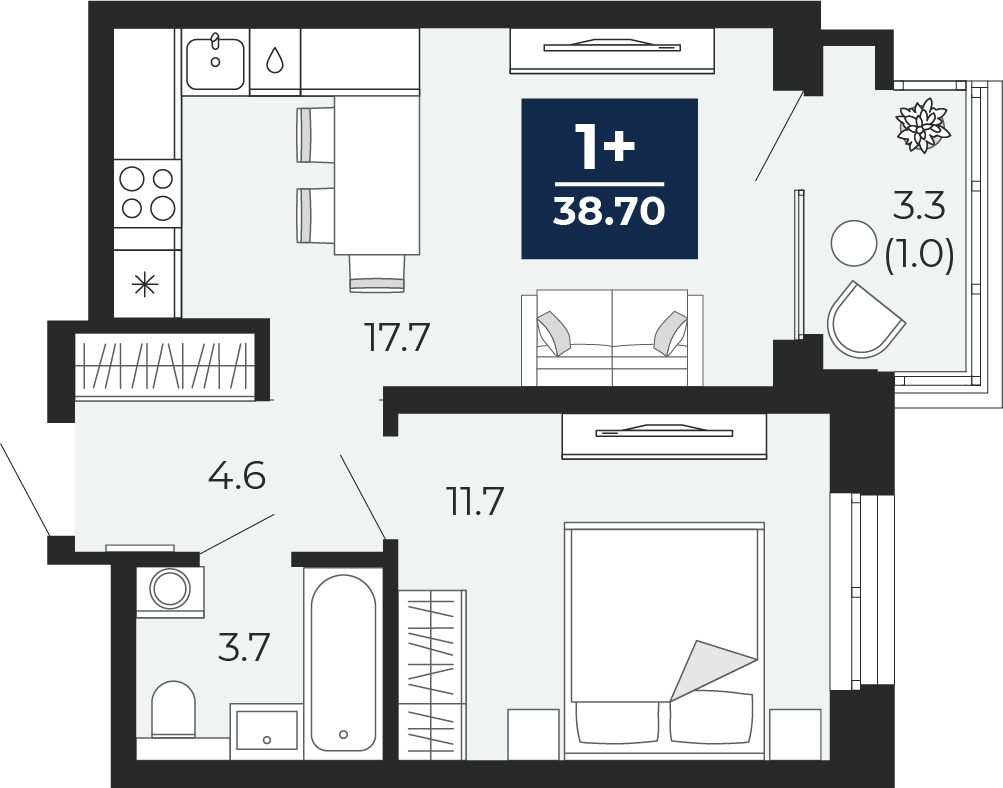 1-комн. квартира от застройщика с предчистовой отделкой в ЖК "Мириады" на 8 этаже. Общая площадь: 38.7 кв.м., жилая: 11.6 кв.м., площадь просторной кухни-столовой: 18.4 кв.м. Все окна выходят на одну сторону. В квартире один совмещенный санузел. Высота потолков 2.7 м. Дом монолитный, трехподъездный, переменной этажности, от 14 до 16 этажей. Квартира находится в 3-й секции высотой 14 этажей в корпусе ГП-72.103. На этаже 8 квартир. В подъезде 1 пассажирский и 1 грузовой лифт. Окончание строительства - 4 квартал 2025 года. Оформление сделки по договору долевого участия. Вселенная бесконечных историй. Ранее невиданный Тюмени масштаб: территория 240 гектаров и 1 650 000 м² застройки. Мириады – это город масштабных перемен и больших возможностей. Город зеленых рощ и зеркальных озер. Город для работы, учебы и развлечений. Город для детей и их родителей. Город для всех и каждого. Проект расположен в районе Мыс рядом с ТРЦ «Тюмень Сити Молл» в границах улицы Тимофея Чаркова, Тобольского тракта и объездной дороги. Срок полного освоения территории - до 2034 года. (AQID02536526)