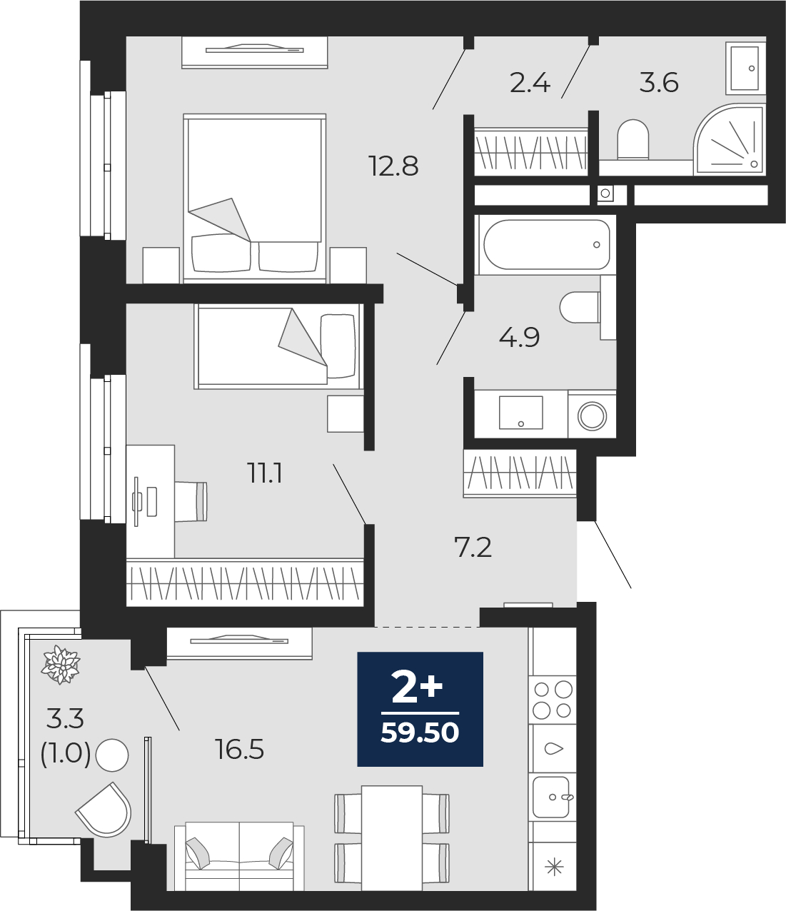 - Общая площадь 59.5 м²