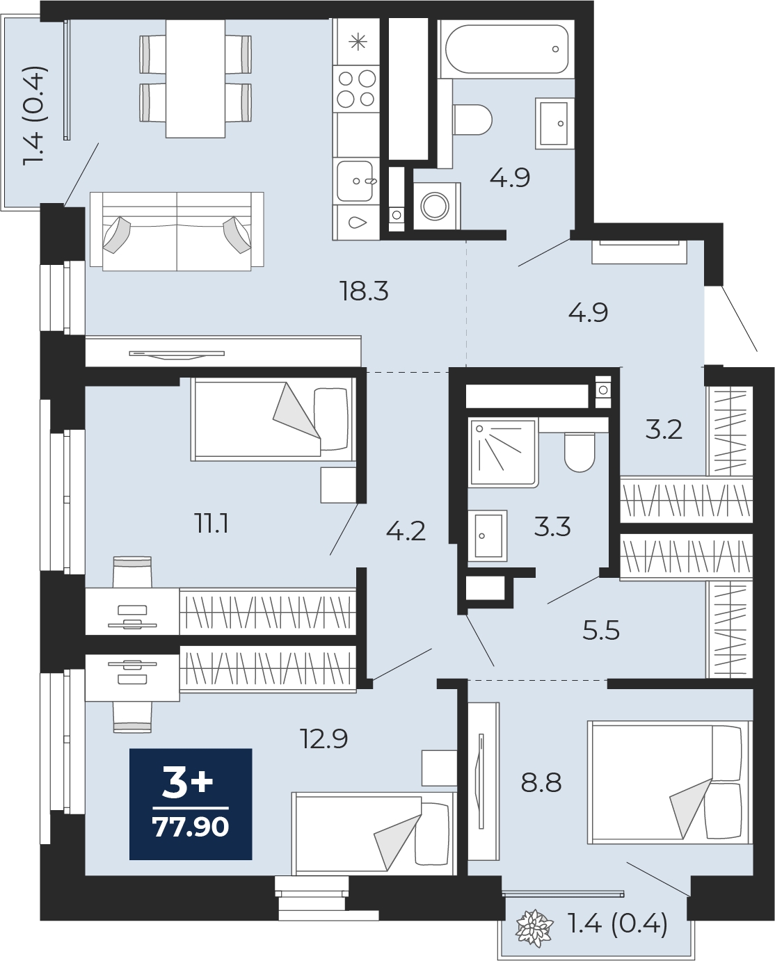 Просторная 3-комн. квартира с предчистовой отделкой в ЖК "Мириады" на 3 этаже. Общая площадь: 77.9 кв.м., жилая: 32.8 кв.м., площадь просторной кухни-столовой: 18.3 кв.м. Квартира угловая, идеально подойдет любителям тишины и панорамных видов. В квартире два балкона, два совмещенных санузла. Высота потолков 2.7 м. Дом монолитный, двухподъездный, переменной этажности, от 14 до 18 этажей. Квартира находится в 1-й секции высотой 18 этажей в корпусе ГП-72.104. На этаже 6 квартир. В подъезде 1 пассажирский и 1 грузовой лифт. Окончание строительства - 4 квартал 2025 года. Оформление сделки по договору долевого участия. Вселенная бесконечных историй. Ранее невиданный Тюмени масштаб: территория 240 гектаров и 1 650 000 м² застройки. Мириады – это город масштабных перемен и больших возможностей. Город зеленых рощ и зеркальных озер. Город для работы, учебы и развлечений. Город для детей и их родителей. Город для всех и каждого. Проект расположен в районе Мыс рядом с ТРЦ «Тюмень Сити Молл» в границах улицы Тимофея Чаркова, Тобольского тракта и объездной дороги. Срок полного освоения территории - до 2034 года. (AQID02536582)