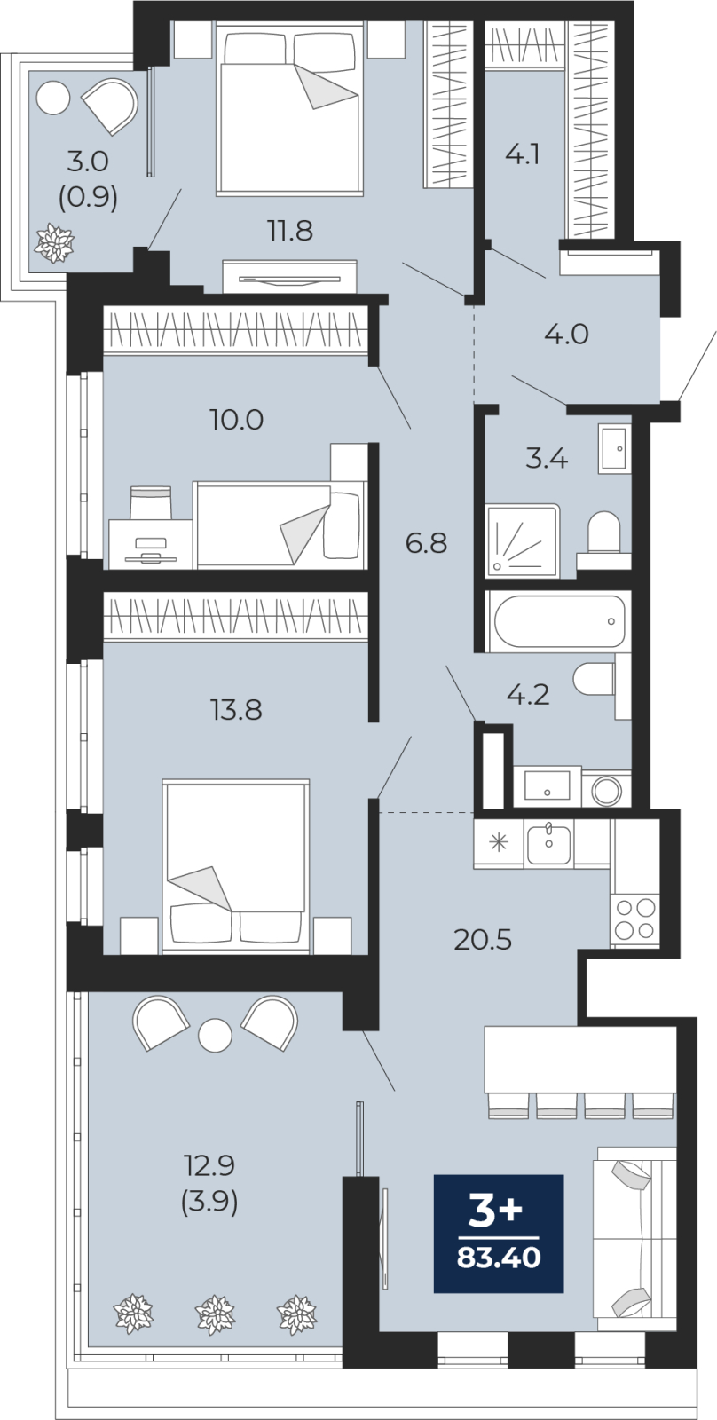 3-комн. квартира от застройщика с предчистовой отделкой в ЖК "Мириады" на 10 этаже. Общая площадь: 83.4 кв.м. Высота потолков 2.7 м. Дом монолитный, двухподъездный, переменной этажности, от 14 до 18 этажей. Квартира находится во 2-й секции высотой 14 этажей в корпусе ГП-72.104. На этаже 8 квартир. В подъезде 1 пассажирский и 1 грузовой лифт. Окончание строительства - 4 квартал 2025 года. Оформление сделки по договору долевого участия. Вселенная бесконечных историй. Ранее невиданный Тюмени масштаб: территория 240 гектаров и 1 650 000 м² застройки. Мириады – это город масштабных перемен и больших возможностей. Город зеленых рощ и зеркальных озер. Город для работы, учебы и развлечений. Город для детей и их родителей. Город для всех и каждого. Проект расположен в районе Мыс рядом с ТРЦ «Тюмень Сити Молл» в границах улицы Тимофея Чаркова, Тобольского тракта и объездной дороги. Срок полного освоения территории - до 2034 года. (AQID02536583)