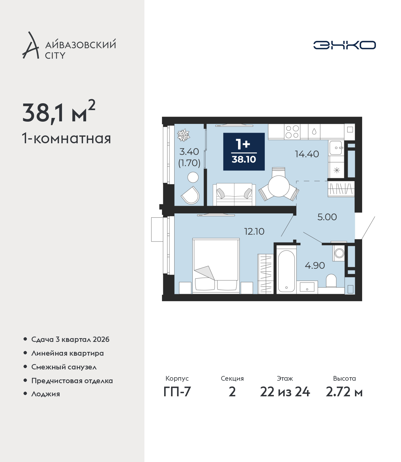 Квартира 1-комн., 38 м2, 22/24 этаж,