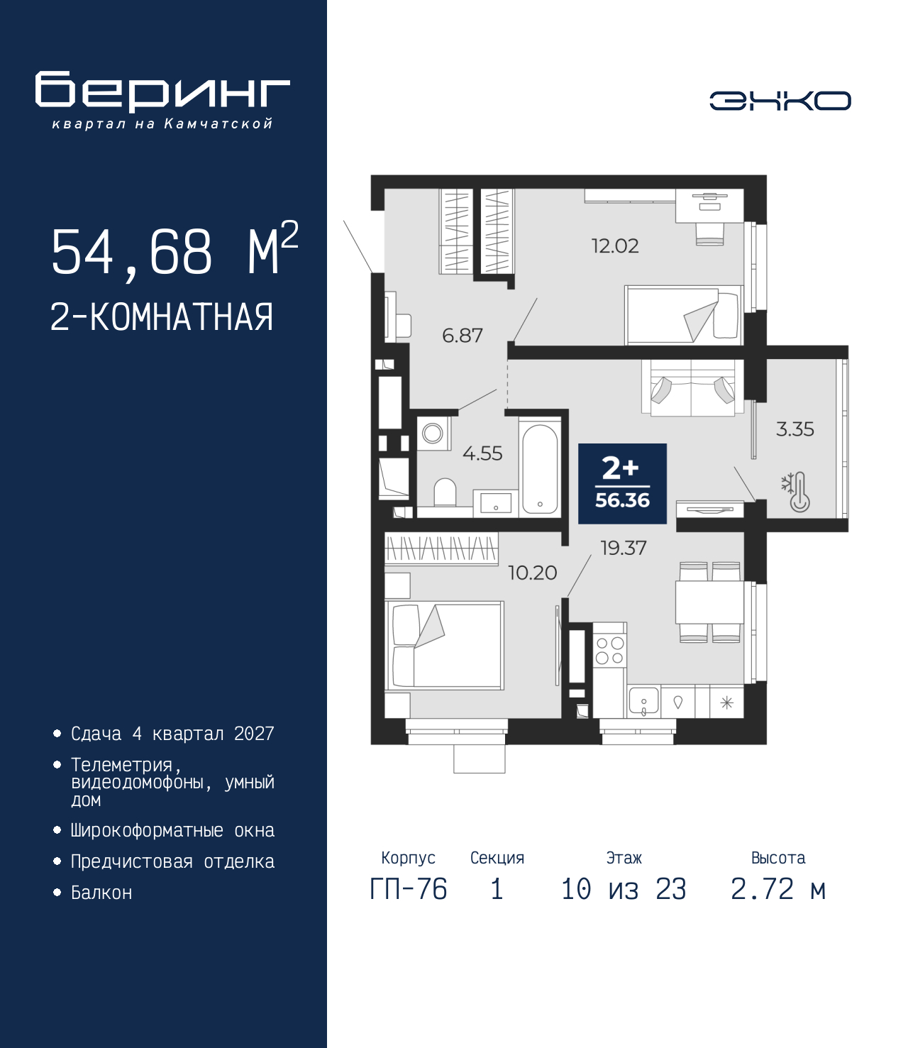 Продается 2-комн. квартира с предчистовой отделкой в ЖК "Беринг" на 10 этаже. Общая площадь: 54.68 кв.м., жилая: 22.22 кв.м., площадь просторной кухни-столовой: 19.37 кв.м. Угловая квартира, очень светлая, естественная вентиляция при открытии окон. В квартире один балкон, один совмещенный санузел. Высота потолков 2.72 м. Дом монолитный, черырехподъездный, переменной этажности, от 19 до 24 этажей. Квартира находится в 1-й секции высотой 23 этажа в корпусе ГП-76. На этаже 7 квартир. В подъезде 2 пассажирских и 1 грузовой лифт. Окончание строительства - 4 квартал 2027 года. Оформление сделки по договору долевого участия. Подобно знаменитому исследователю, мы чувствуем себя первооткрывателями этой локации. Хотим показать новую суть места, сформировать для вас жизненный опыт, которого ещё не было. Беринг — район зелёного цвета. Беринг — район, который откроется вам с другой стороны. Впечатлит новым уровнем комфорта и качеством жизни. Беринг — открытие на карте города. Первый квартал расположен в районе Тура, в границах улиц: Камчатская – Западносибирская – Энтузиастов. Вокруг уже есть всё для того, чтобы ежедневная рутина была лишь частью жизни и не доставляла дискомфорта. Школы и детские сады, магазины и аптеки, поликлиника, места для семейного отдыха, пеших и велопрогулок, и даже рыбалки. Масштабное озеленение дворов — визитная карточка ЭНКО и ваш оазис спокойствия, чтобы отвлечься от повседневности. Раскидистые деревья, кустарники, травы и цветы — осталось остановиться, вдохнуть и расслабиться, глядя на эту природную красоту. Стилистика подъездов продолжает концепцию Беринга, вдохновлённого Камчаткой: сдержанный, но при этом впечатляющий дизайн соседствует с удобством и функциональностью. (AQID02517998)