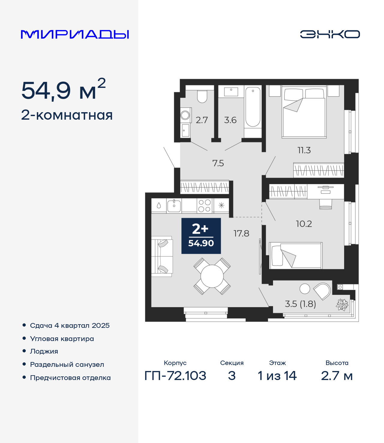 Продается двухкомнатная квартира с предчистовой отделкой в ЖК "Мириады" на 1 этаже. Общая площадь: 54.9 кв.м., жилая: 21.5 кв.м., площадь просторной кухни-столовой: 17.8 кв.м. Квартира угловая, идеально подойдет любителям тишины и панорамных видов. В квартире одна лоджия, один раздельный санузел. Высота потолков 2.7 м. Дом монолитный, трехподъездный, переменной этажности, от 14 до 16 этажей. Квартира находится в 3-й секции высотой 14 этажей в корпусе ГП-72.103. На этаже 8 квартир. В подъезде 1 пассажирский и 1 грузовой лифт. Окончание строительства - 4 квартал 2025 года. Оформление сделки по договору долевого участия. Вселенная бесконечных историй. Ранее невиданный Тюмени масштаб: территория 240 гектаров и 1 650 000 м² застройки. Мириады – это город масштабных перемен и больших возможностей. Город зеленых рощ и зеркальных озер. Город для работы, учебы и развлечений. Город для детей и их родителей. Город для всех и каждого. Проект расположен в районе Мыс рядом с ТРЦ «Тюмень Сити Молл» в границах улицы Тимофея Чаркова, Тобольского тракта и объездной дороги. Срок полного освоения территории - до 2034 года. (AQID02522660)