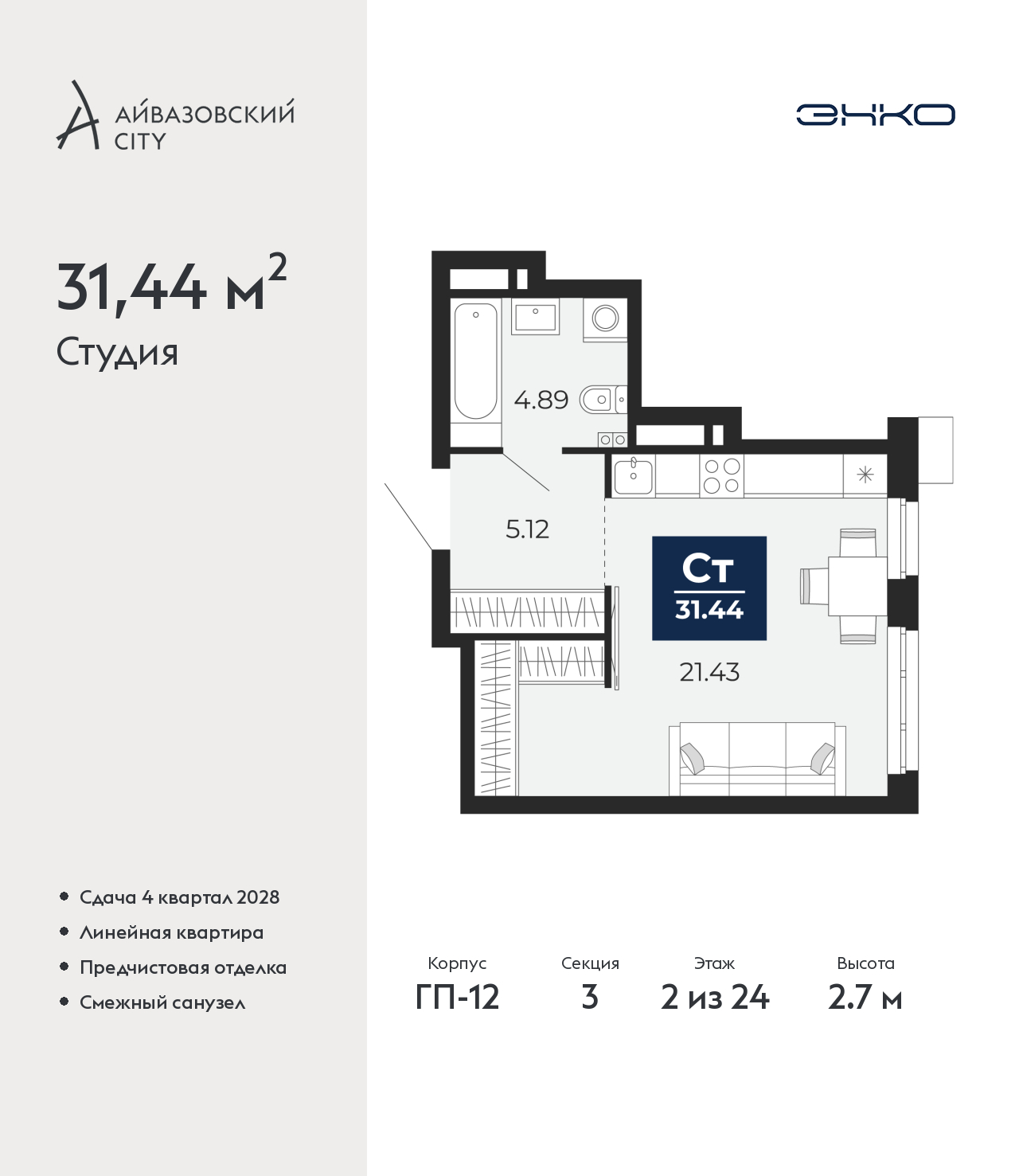 Продается 1-комн. квартира-студия с предчистовой отделкой в ЖК "Айвазовский City" на 2 этаже. Общая площадь: 31.44 кв.м., площадь гостиной 21.43 кв.м., из которых 5 кв.м. выделено под кухонную зону. Все окна выходят на одну сторону. В квартире один совмещенный санузел. Высота потолков 2.7 м. Дом монолитный, многоподъездный, высотой 24 этажа. Квартира находится в 3-й секции в корпусе ГП-12. На этаже 6 квартир. В подъезде 1 пассажирский и 1 грузовой лифт. Окончание строительства - 4 квартал 2028 года. Оформление сделки по договору долевого участия. Новый жилой район располагается в живописном месте на берегу Туры в центральной части города. Принципиально новое пространство для жизни в центре современного города для тех, чьи мечты сбываются, кто нацелен на постоянный рост, перемены к лучшему для себя и своих близких. Каждая деталь Айвазовский City вдохновляет и заряжает на новые свершения: авторская архитектура, сбалансированная продуманная инфраструктура, дизайнерские дворы со спортивными и детскими площадками, парковые зоны с фонтанами, водный канал, украшающий центральный прогулочный маршрут района и многое другое. В 2019 года проект стал лауреатом престижной премии Urban Awards 2019 в номинации «Лучший строящийся региональный жилой комплекс бизнес-класса». Главная особенность Айвазовский City - соседство разных архитектурных школ в рамках одного дома. Изысканная классика, выразительная эклектика и оригинальный модерн - жить в одном из таких домов настоящий повод для гордости. Айвазовский City это идеальное сочетание комфорта, технологий и развитой инфраструктуры. Вход в подъезд возможен с улицы и со двора. Отправляясь на работу или за покупками, жители могут выйти с внешней стороны дома, а для прогулки с ребенком – со стороны двора. Экологически чистые материалы и энергосберегающие технологии, качественное освещение общественных зон, видеонаблюдение по всей территории жилого района (в том числе в подъездах, лифтах и в подземном паркинге), закрытые дворы с доступом только для жителей Айвазовский City. Часть домов в Айвазовский City будут оснащены подземным паркингом. Востребованный в нашем климатическом поясе формат хранения автомобилей защитит собственность владельца в любое время года. Аккредитация в банках: ПАО «Газпромбанк», «Сбербанк России», ОАО «Альфа-Банк», ПАО Банк «ВТБ», ПАО Банк «ФК Открытие» и других. (AQID02525502)