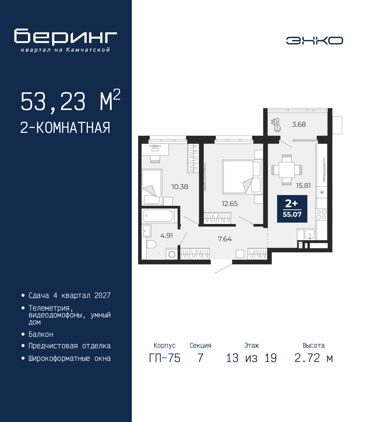 Двухкомнатная квартира с предчистовой отделкой в ЖК "Беринг" на 13 этаже. Общая площадь: 53.23 кв.м., жилая: 23.03 кв.м., площадь просторной кухни-столовой: 15.81 кв.м. Комнаты изолированные, все окна выходят на одну сторону. В квартире один балкон, один совмещенный санузел. Высота потолков 2.72 м. Дом монолитный, многоподъездный, переменной этажности, от 17 до 24 этажей. Квартира находится в 7-й секции высотой 19 этажей в корпусе ГП-75. На этаже 7 квартир. В подъезде 2 пассажирских и 1 грузовой лифт. Окончание строительства - 4 квартал 2027 года. Оформление сделки по договору долевого участия. Подобно знаменитому исследователю, мы чувствуем себя первооткрывателями этой локации. Хотим показать новую суть места, сформировать для вас жизненный опыт, которого ещё не было. Беринг — район зелёного цвета. Беринг — район, который откроется вам с другой стороны. Впечатлит новым уровнем комфорта и качеством жизни. Беринг — открытие на карте города. Первый квартал расположен в районе Тура, в границах улиц: Камчатская – Западносибирская – Энтузиастов. Вокруг уже есть всё для того, чтобы ежедневная рутина была лишь частью жизни и не доставляла дискомфорта. Школы и детские сады, магазины и аптеки, поликлиника, места для семейного отдыха, пеших и велопрогулок, и даже рыбалки. Масштабное озеленение дворов — визитная карточка ЭНКО и ваш оазис спокойствия, чтобы отвлечься от повседневности. Раскидистые деревья, кустарники, травы и цветы — осталось остановиться, вдохнуть и расслабиться, глядя на эту природную красоту. Стилистика подъездов продолжает концепцию Беринга, вдохновлённого Камчаткой: сдержанный, но при этом впечатляющий дизайн соседствует с удобством и функциональностью. (AQID02529667)