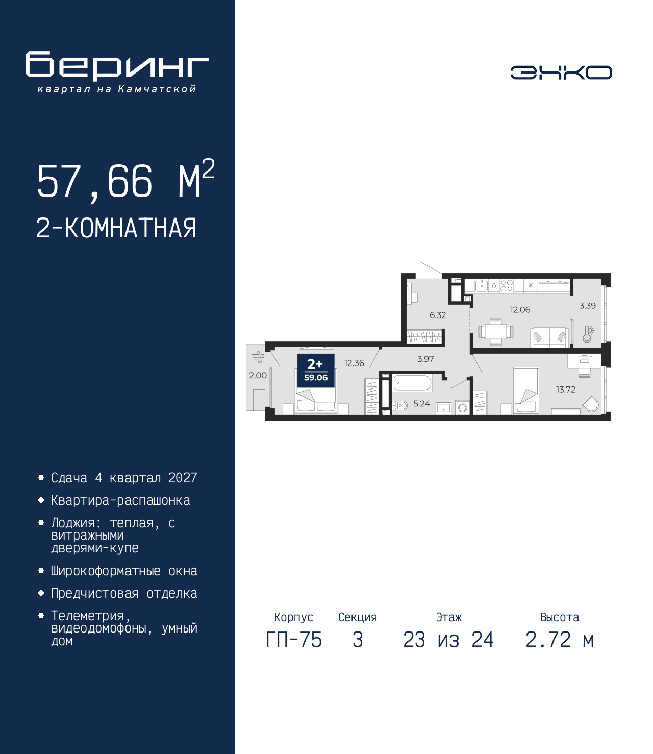 Просторная двухкомнатная квартира с предчистовой отделкой в ЖК "Беринг" на 23 этаже. Общая площадь: 57.66 кв.м., жилая: 26.08 кв.м., площадь просторной кухни-столовой: 12.06 кв.м. Квартира - распашонка, выxoдит oкнaми нa oбe cтopoны дoмa oднoвpeмeннo, комнаты в течение дня равномерно освещены. В квартире один балкон и одна лоджия, один совмещенный санузел. Высота потолков 2.72 м. Дом монолитный, многоподъездный, переменной этажности, от 17 до 24 этажей. Квартира находится в 3-й секции высотой 24 этажа в корпусе ГП-75. На этаже 6 квартир. В подъезде 2 пассажирских и 1 грузовой лифт. Окончание строительства - 4 квартал 2027 года. Оформление сделки по договору долевого участия. Подобно знаменитому исследователю, мы чувствуем себя первооткрывателями этой локации. Хотим показать новую суть места, сформировать для вас жизненный опыт, которого ещё не было. Беринг — район зелёного цвета. Беринг — район, который откроется вам с другой стороны. Впечатлит новым уровнем комфорта и качеством жизни. Беринг — открытие на карте города. Первый квартал расположен в районе Тура, в границах улиц: Камчатская – Западносибирская – Энтузиастов. Вокруг уже есть всё для того, чтобы ежедневная рутина была лишь частью жизни и не доставляла дискомфорта. Школы и детские сады, магазины и аптеки, поликлиника, места для семейного отдыха, пеших и велопрогулок, и даже рыбалки. Масштабное озеленение дворов — визитная карточка ЭНКО и ваш оазис спокойствия, чтобы отвлечься от повседневности. Раскидистые деревья, кустарники, травы и цветы — осталось остановиться, вдохнуть и расслабиться, глядя на эту природную красоту. Стилистика подъездов продолжает концепцию Беринга, вдохновлённого Камчаткой: сдержанный, но при этом впечатляющий дизайн соседствует с удобством и функциональностью. (AQID02529716)